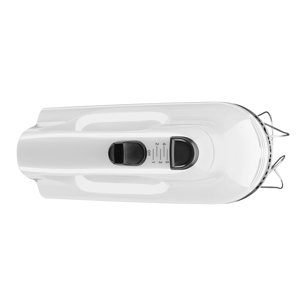 Geleverd met praktische opzetstukken De handmixer is voorzien van twee roestvrijstalen turbokloppers waarmee je in een handomdraai koekjesdeeg of cakebeslag maakt. Met de 16-draadgarde maak je de beste slagroom, sauzen of pudding. Met maar liefst één hand werp je de toebehoren uit de handmixer en kunnen ze zo de vaatwasmachine in.