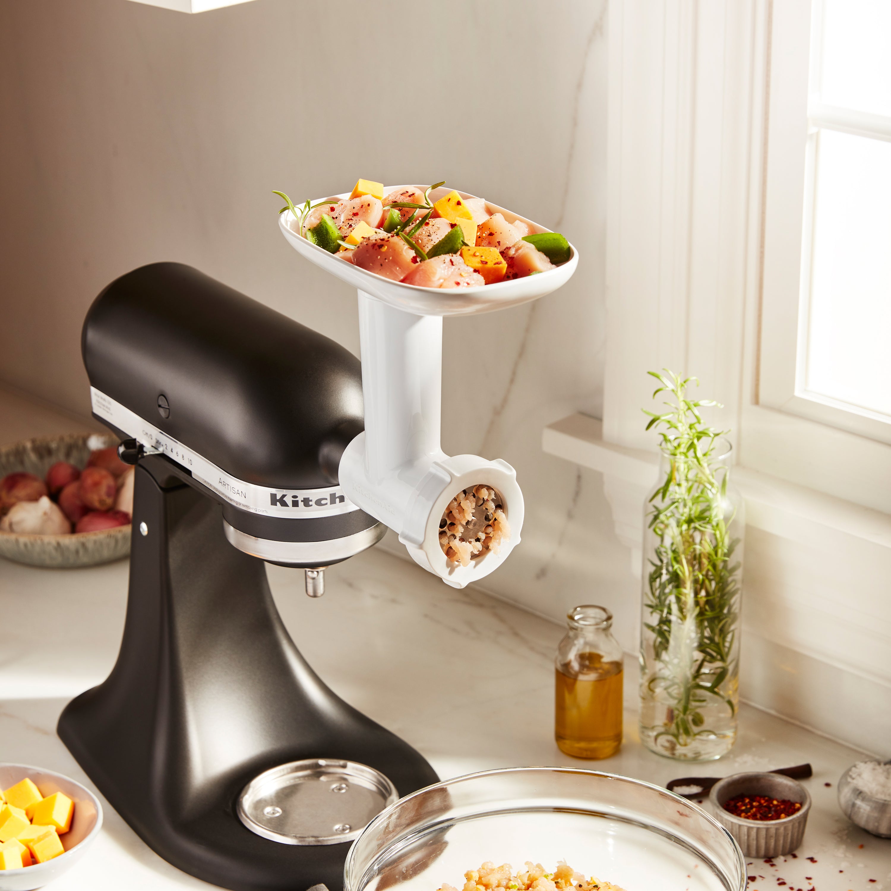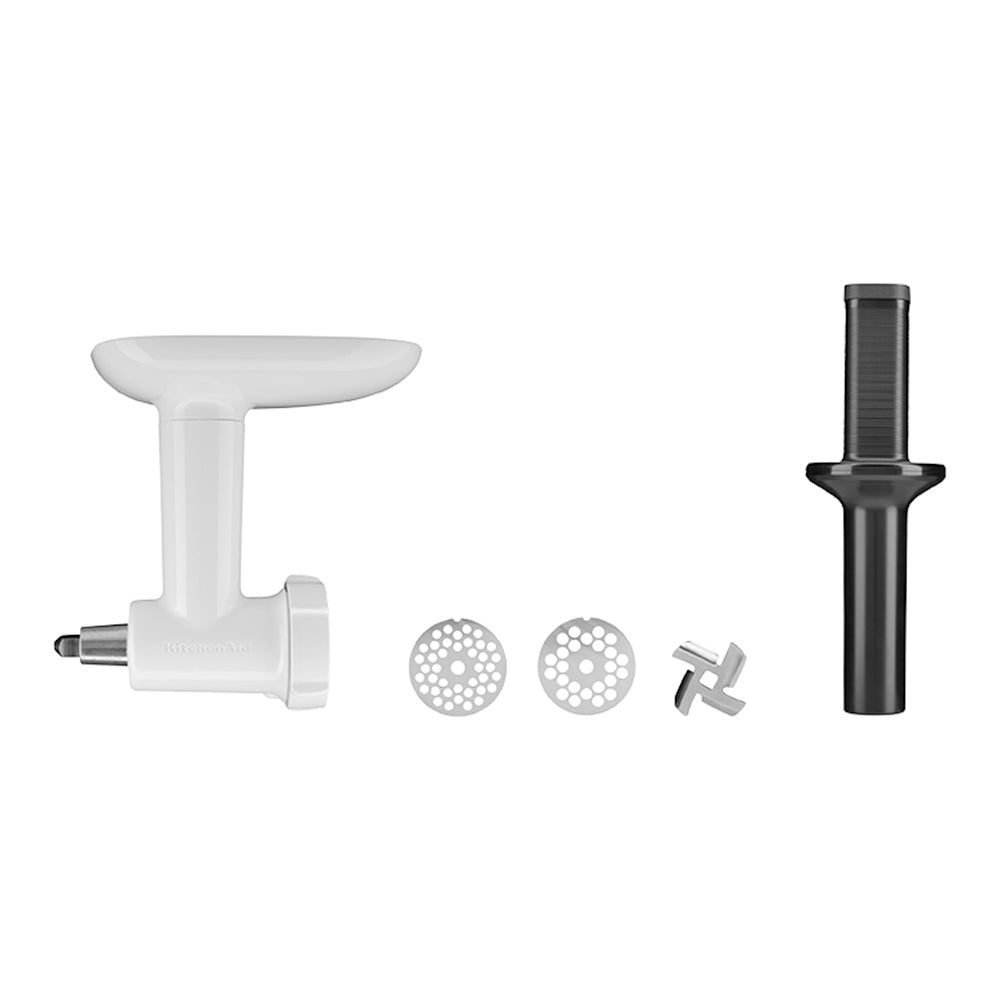 De KitchenAid 5KSMFGA voedselmolen is niet alleen geschikt voor het verwerken van vlees. Je kunt er zelfs droog brood mee kruimelen of noten mee raspen. Met de handige stamper duw je de ingrediënten naar de maalschijven toe, zodat er geen ingrediënten onnodig achter blijven. De maalschijven zijn gemaakt van vaatwasserbestendig roestvrij staal en de grove heeft een maat van 6 mm en de fijne 4,5 mm. De KitchenAid 5KSMFGA voedselmolen is geschikt voor alle KitchenAid keukenmixers. Experimenteer met creatieve ingrediënten!