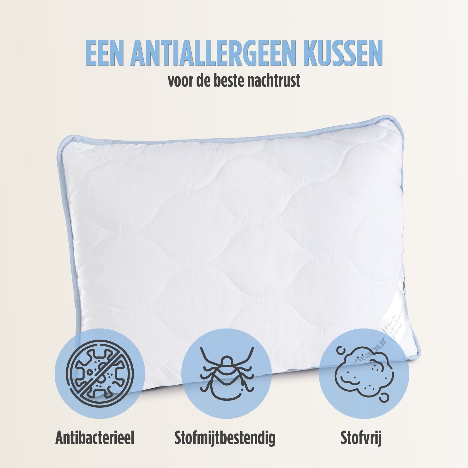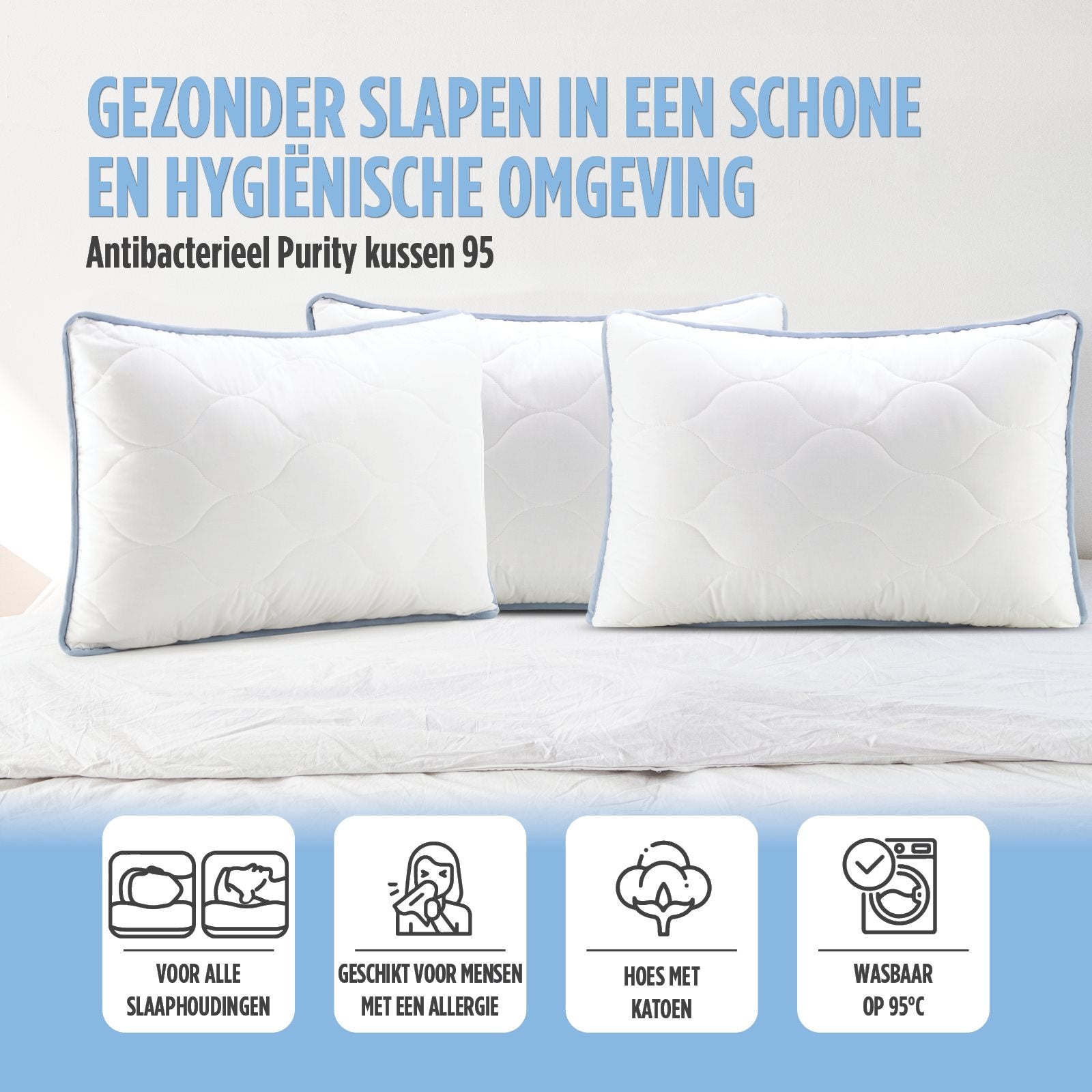 Volledig wasbaar op 95°C Door het innovatieve ontwerp zal dit Purity 95°C hoofdkussen zeker indruk maken. Doordat het volledig wasbaar is op 95°C is het kussen uiterst geschikt voor mensen met allergieën. Hierdoor dood het 99% van de bacteriën en kunt u heerlijk allergie-vrij slapen. Het is daarnaast stofmijtbestendig.