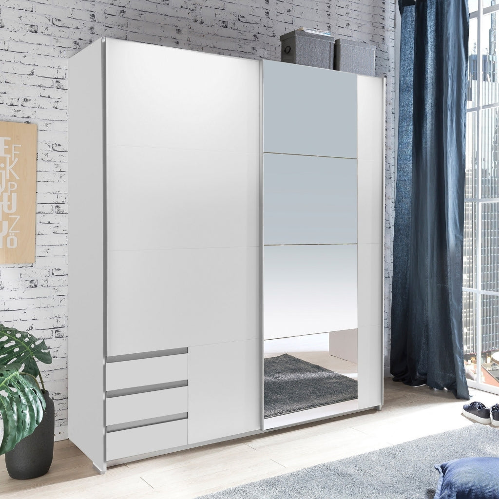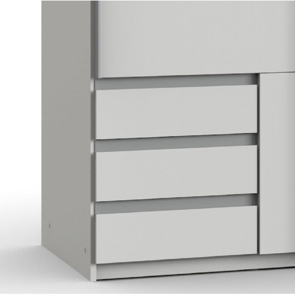 Ben je op zoek naar een mooie en complete opberger voor je kleding en linnengoed? Dan is kledingkast Elsen de ideale keuze voor jou! Deze witte schuifdeurkast wordt geleverd met een compleet interieur, waardoor er voldoende ruimte is voor al je fantastische outfits. Daarnaast zijn de schuifdeuren van de kast handig en ruimtebesparend. Eén van de schuifdeuren is voorzien van een spiegel, wat niet alleen ruimtelijk oogt, maar ook handig is om jezelf te bewonderen. Indeling: De schuifdeurkast Elsen heeft aan de linkerkant veel legplanken, waar je al je kleding kunt opbergen. Daaronder bevinden zich 3 laden voor kleine artikelen zoals ondergoed en sokken. Deze laden zijn handig te gebruiken vanaf de buitenkant van de kast. Aan de rechterkant van de kast is er een plank met daaronder een roede voor al je hangkleding. Belangrijke informatie: De kast heeft een breedte van 179 cm, een diepte van 64 cm en een hoogte van 198 cm. De kast is gemaakt van plaatmateriaal met een witte folie afwerking en het interieur heeft een lichtgrijze kleur. Deze kast wordt staand opgebouwd, wat handig is als je beperkte ruimte hebt. Houd er rekening mee dat er 4 cm tussenruimte nodig is voor de montage en dat de hoogte van het plafond minimaal 202 cm moet zijn.| Afmetingen | |