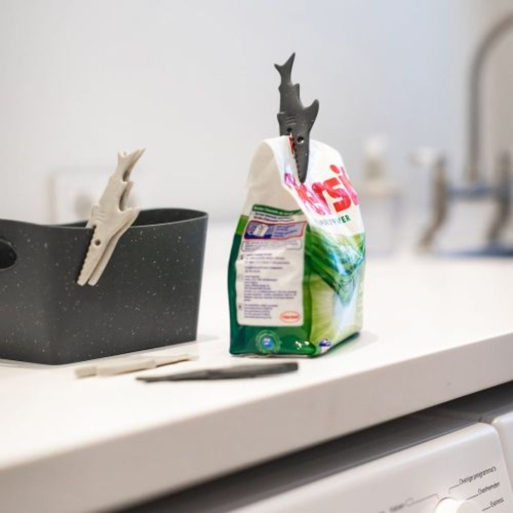 Met de knijpers uit de Sharky-serie van Koziol gaat jouw was niet naar de haaien! De set bestaat uit 20 knijpers in de vorm van een haai, maar dan zonder de metalen veer. Dit zorgt ervoor dat er geen roest op jouw wasgoed kan komen. De knijpers zijn verder extra stevig en doorstaan deze zelfs een storm! Daarnaast zijn de knijpers natuurlijk ook te gebruiken om zakken en tassen af te sluiten. Verder zijn de knijpers gemaakt van gerecycled materiaal, waardoor je met deze knijpers ook nog eens aan de planeet denkt!