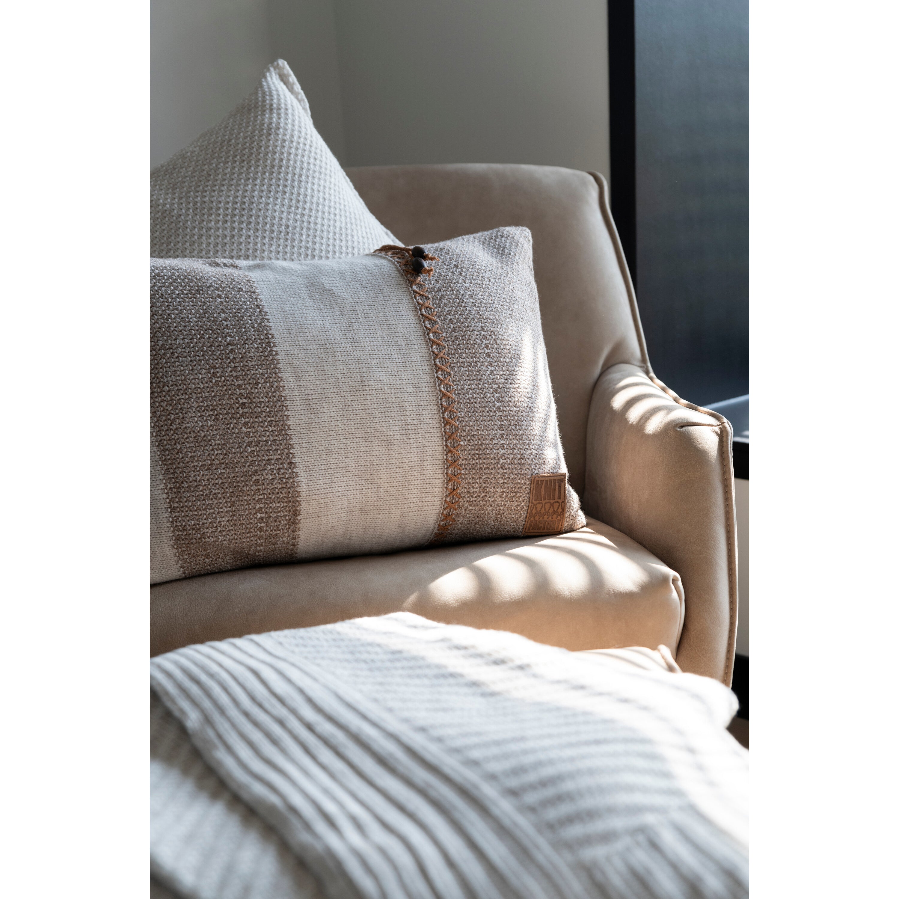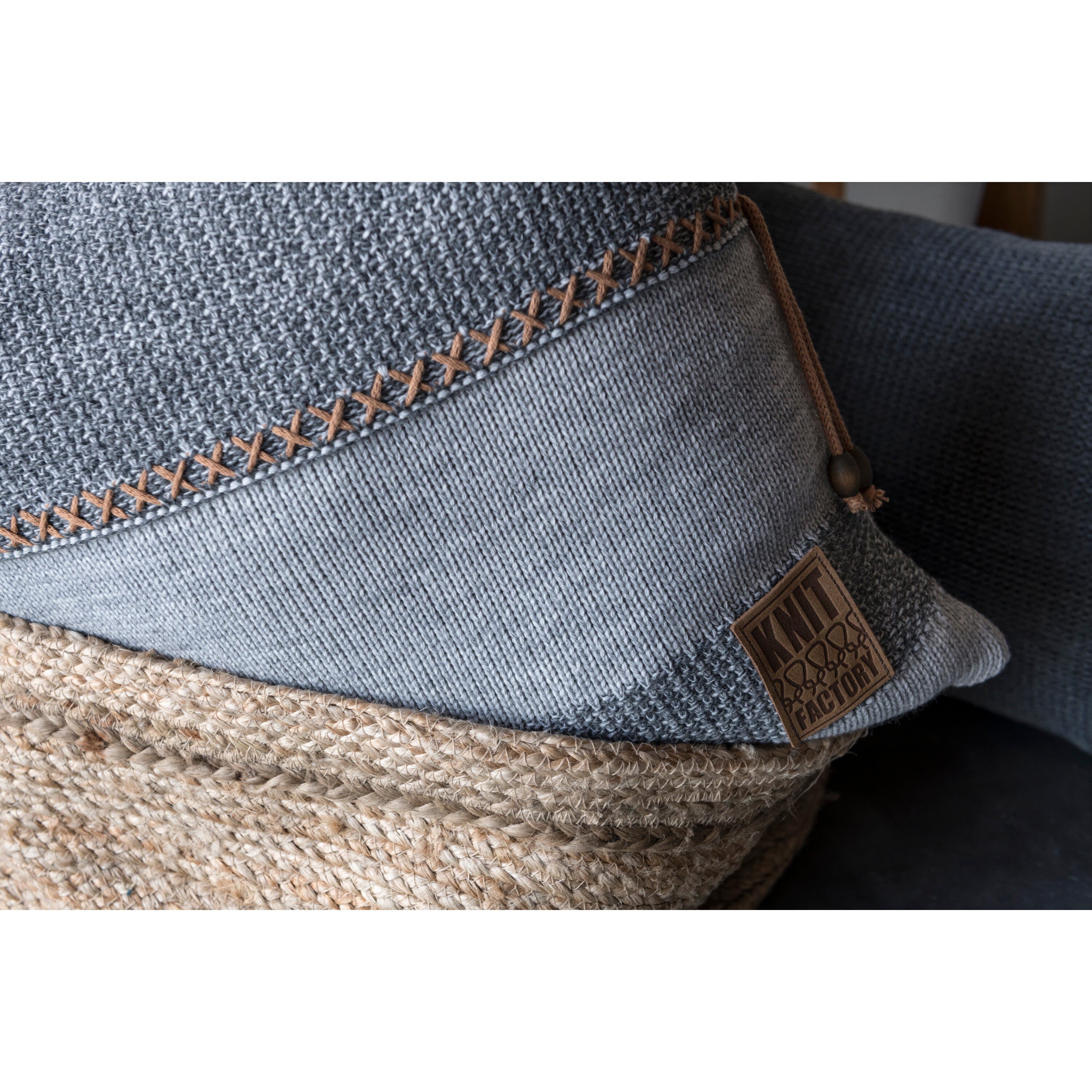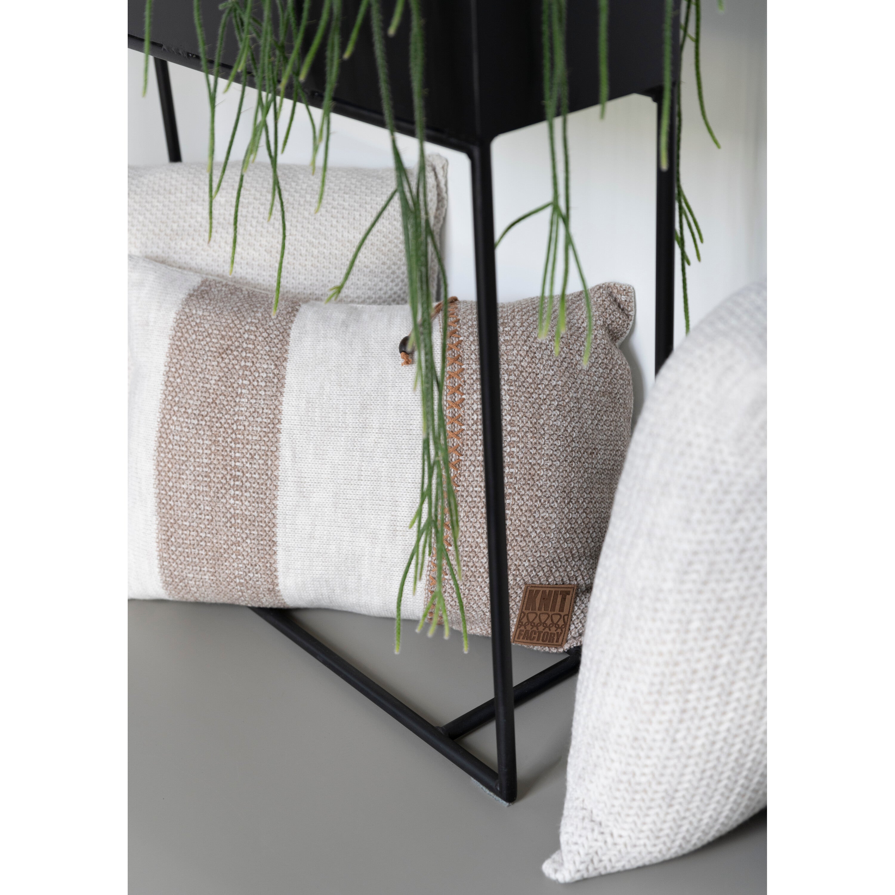 - De afwisseling van grof en fijn breiwerk, de lichte en donkere strepen en het gebreide koordje geven dit sierkussen een opvallende look.