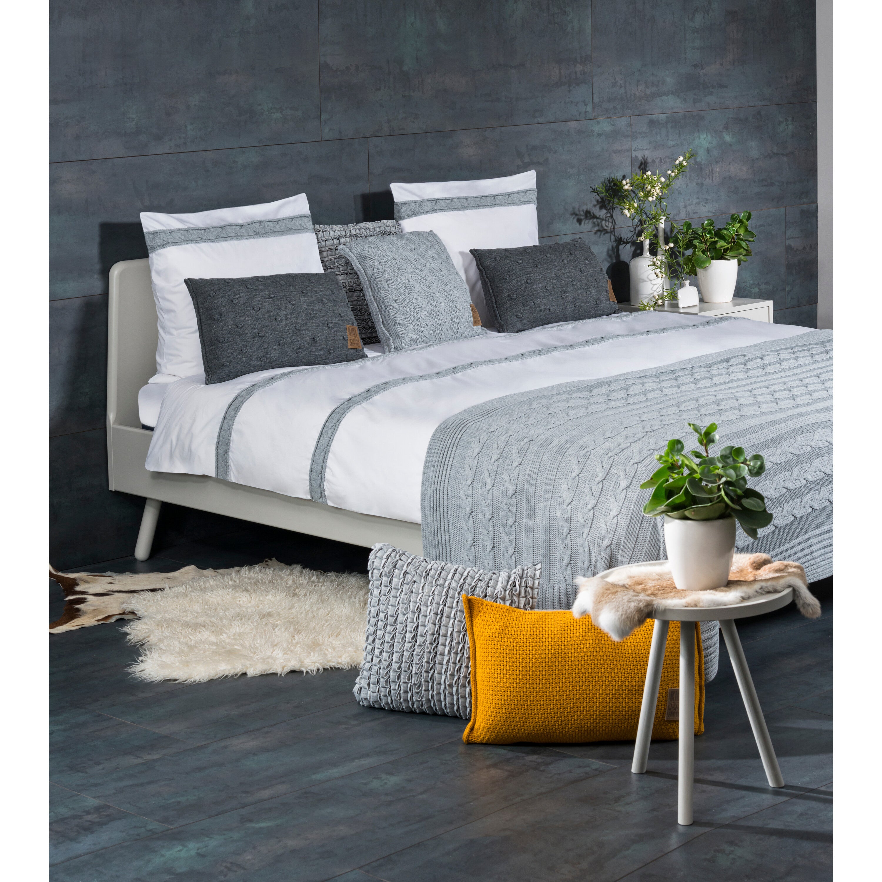 - Combineer de zachte, gebreide sierkussens met de bijpassende gebreide Sasha Plaid en ons luxueuze bedtextiel voor een sfeervol geheel.
