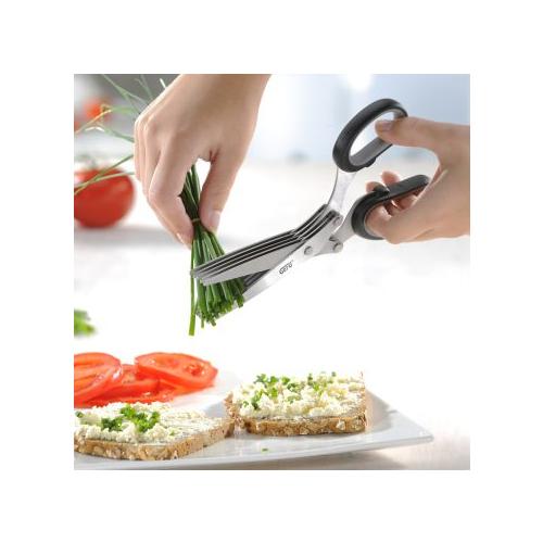 Snel, gemakkelijk en veilig kruiden snijden? Deze kruidenschaar met 5-voudig lemmet heeft kruiden fijn gesneden in een hand om draai terwijl de kruiden de aroma compleet behouden. De schaar komt met handige reinigingskam om de kruiden restjes van de schaar te vegen. De schaar is geheel vaatwasser bestendig en kan dus gemakkelijk worden schoon gemaakt.