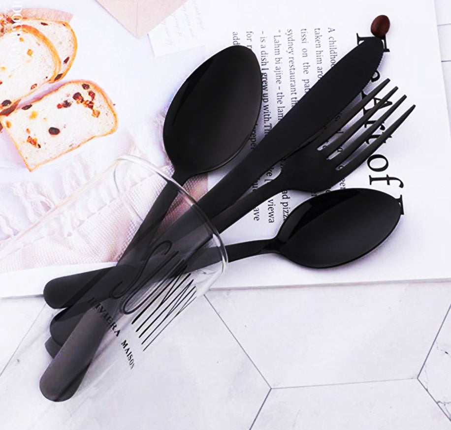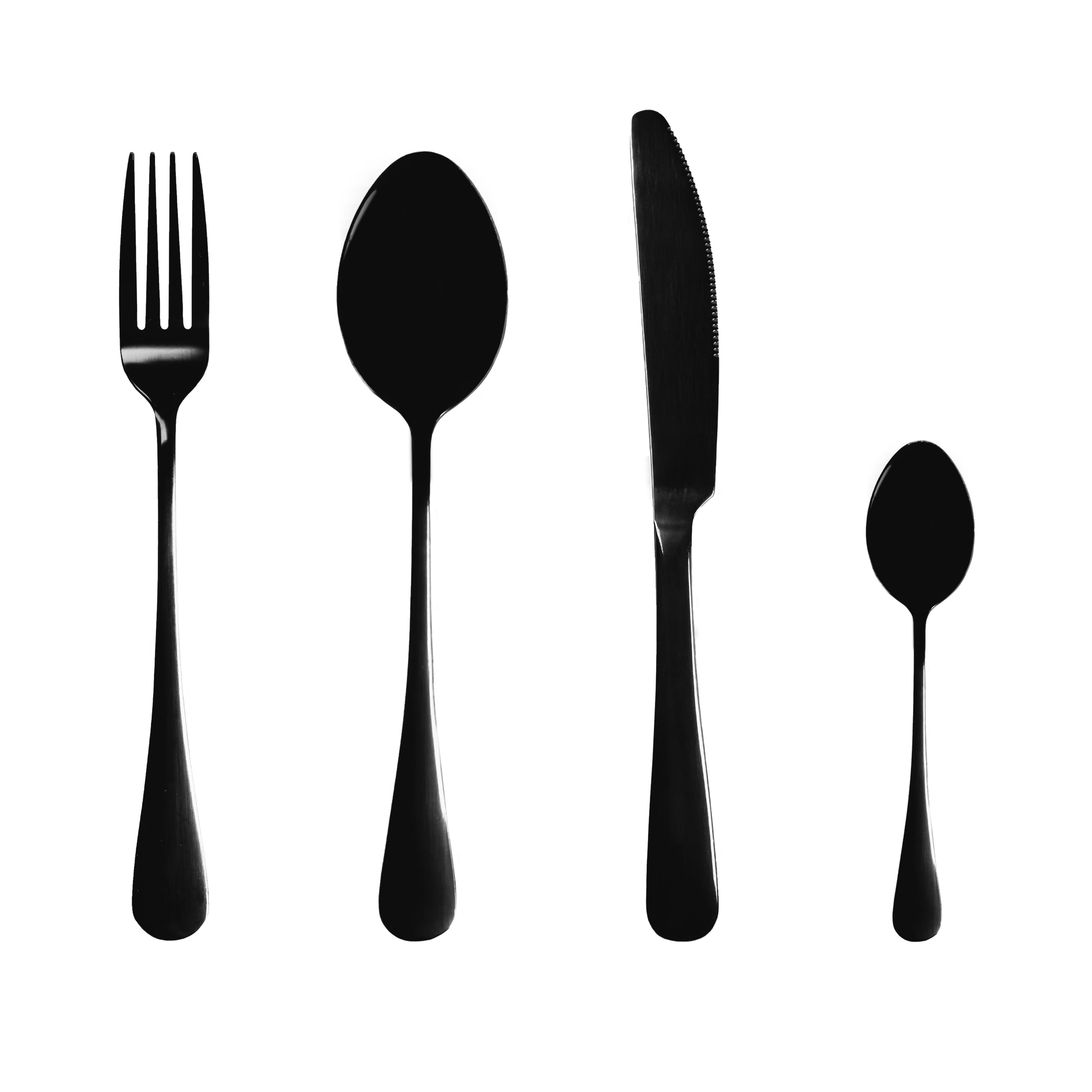 Dit bestek van Krumble bestaat uit een mes, een vork, een grote lepel en een klein lepeltje. Het heeft een strak design en is van zwart staal vervaardigd.