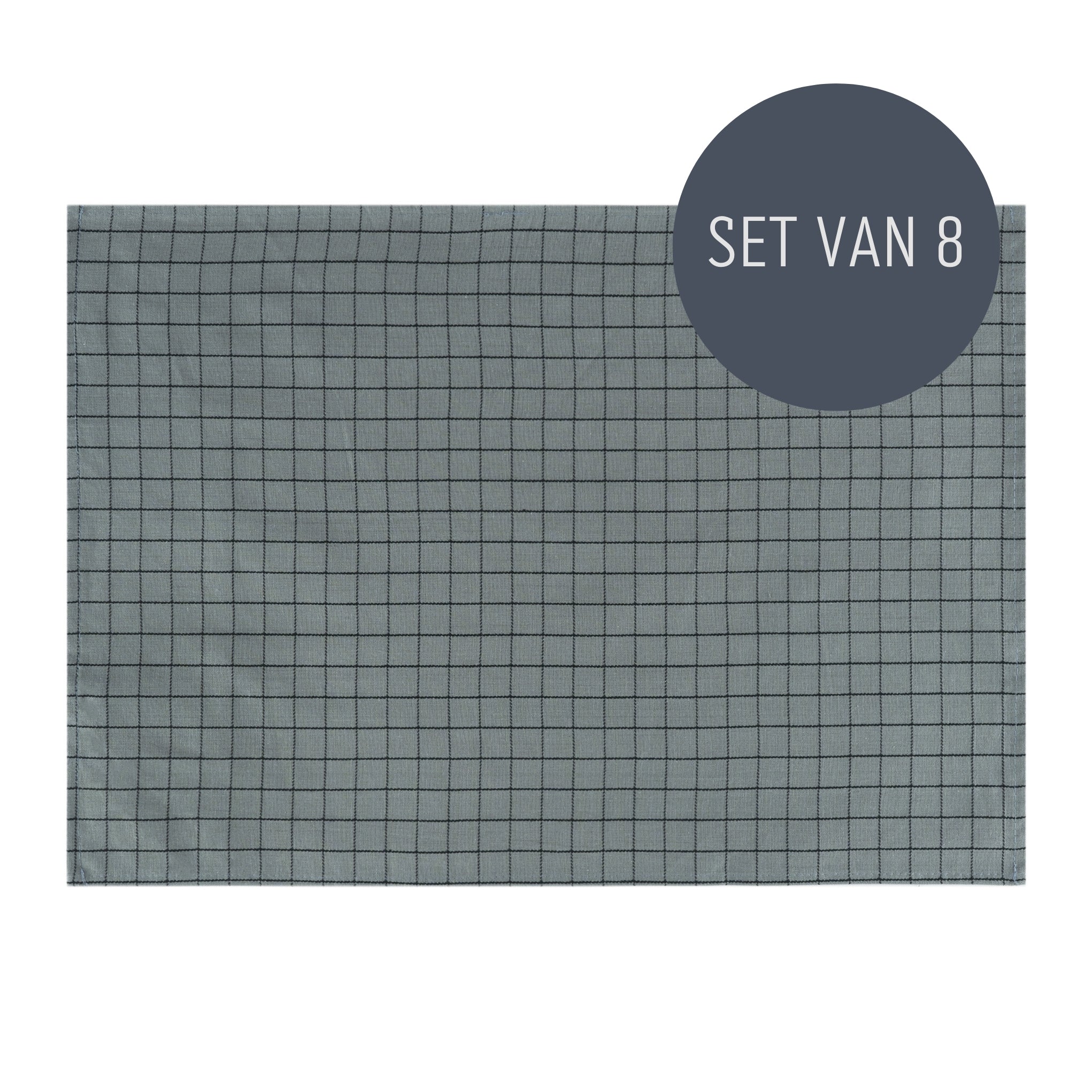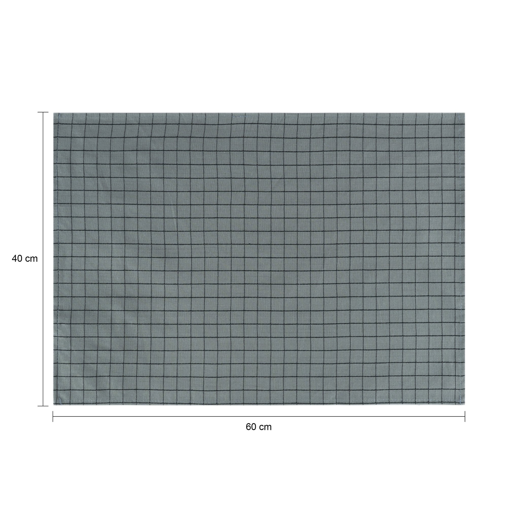 - De grijze theedoek met kleine blokjes is veertig bij zestig centimeter en heeft een rustige uitstraling.