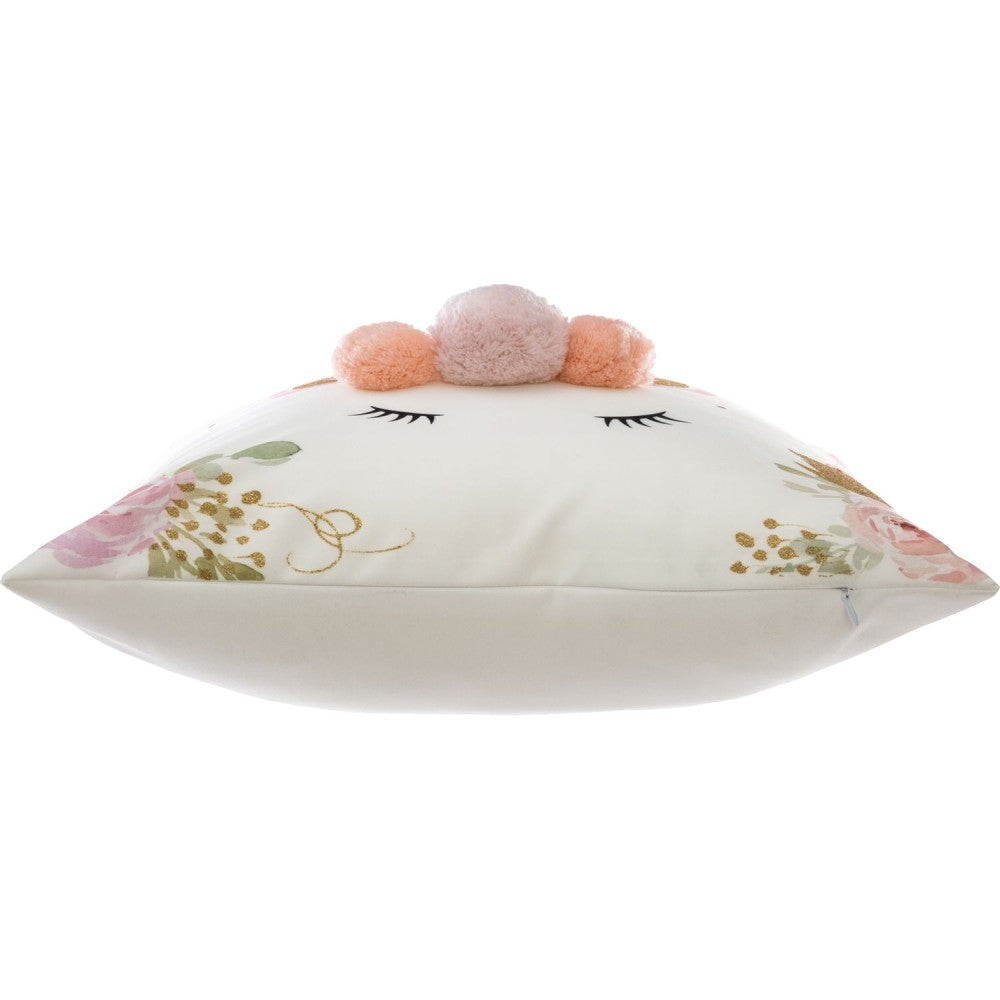 Een vrolijke witte eenhoorn kussen hoes. Leuk voor in een kinderkamer. Stof is zacht en aaibaar. De hoes is afsluitbaar met een verborgen rits aan de onderkant. Op de hoes zit een leuke pon pon detail. Met mooie glinsterende details. Alleen de voorzijde van de kussensloop is met print, de achterzijde is effen wit.