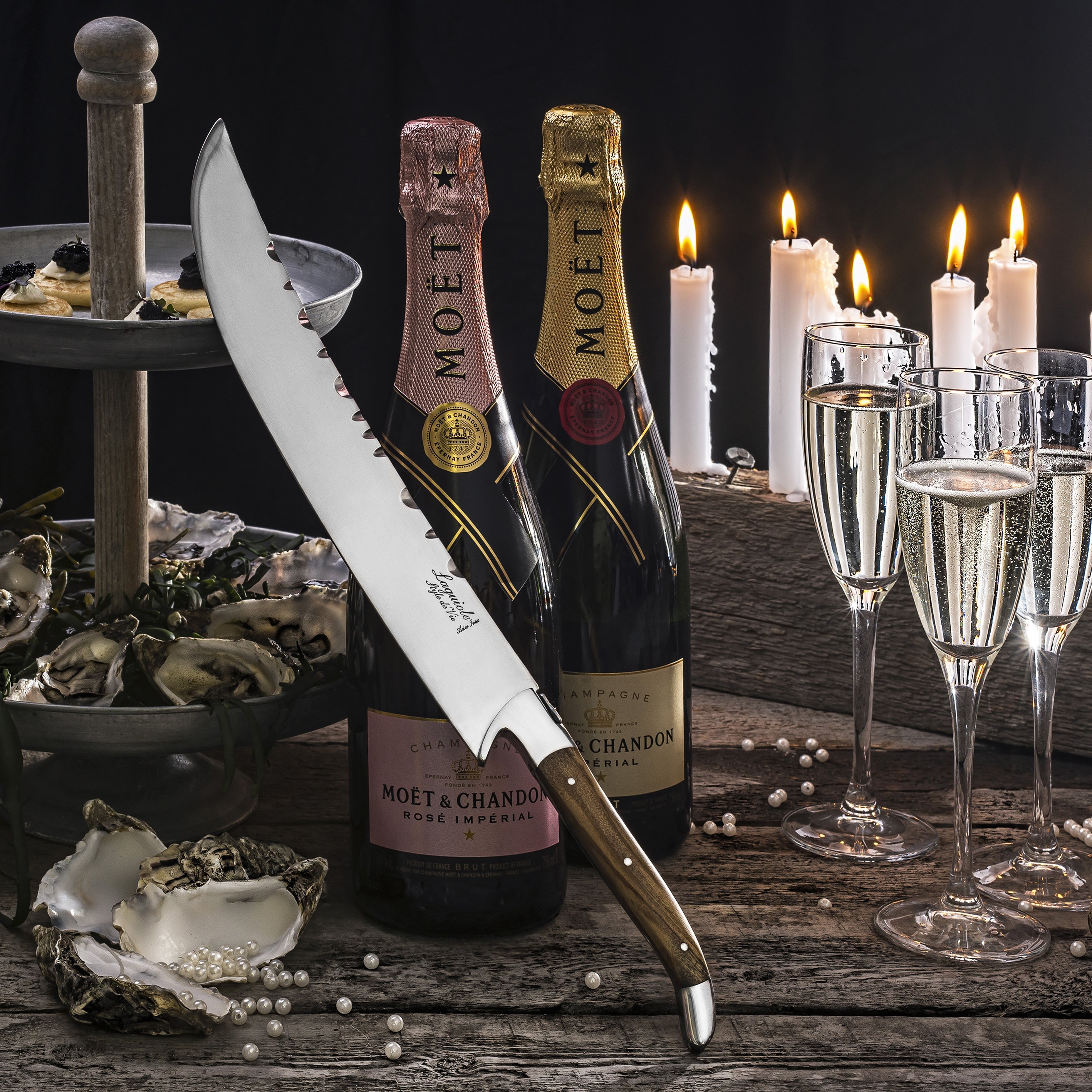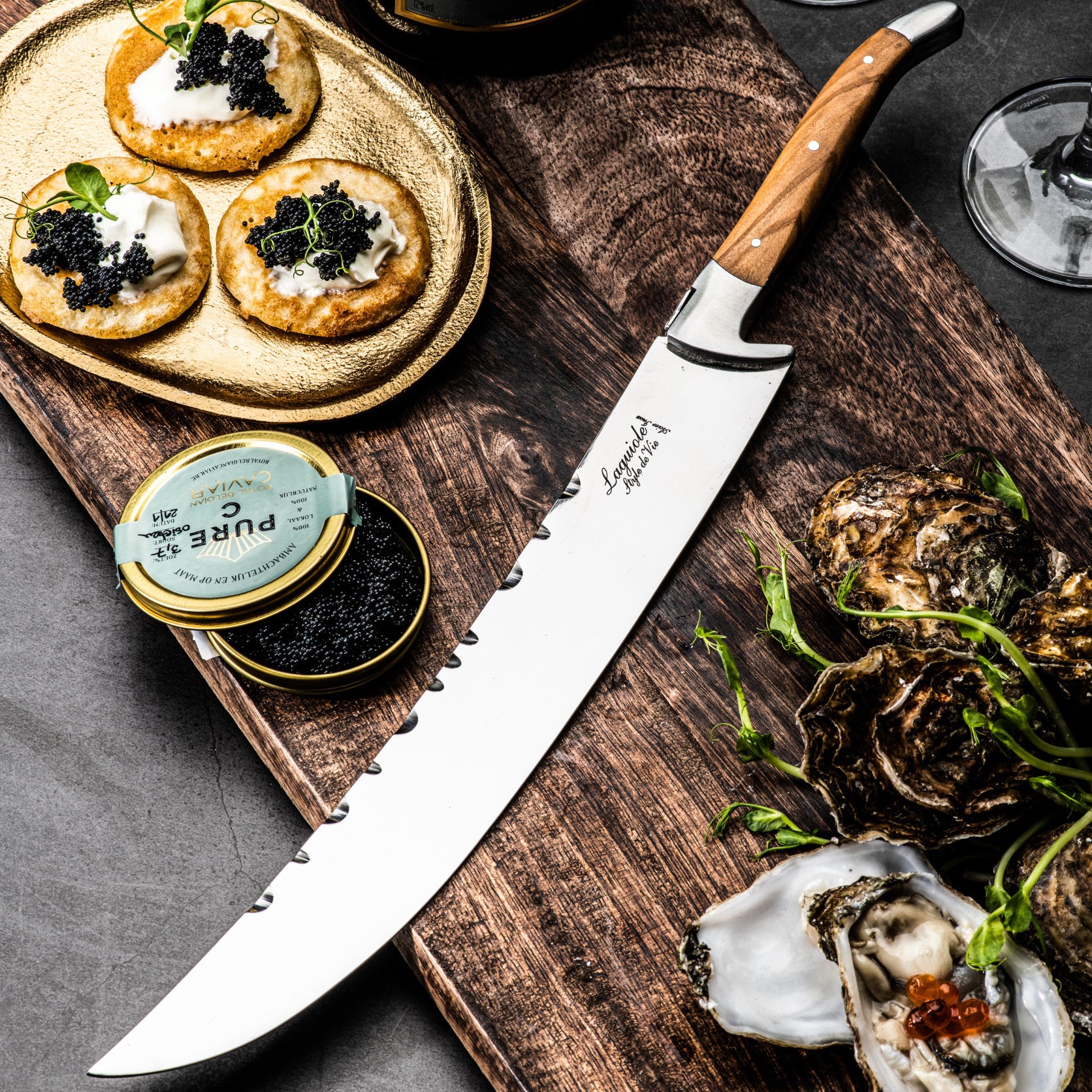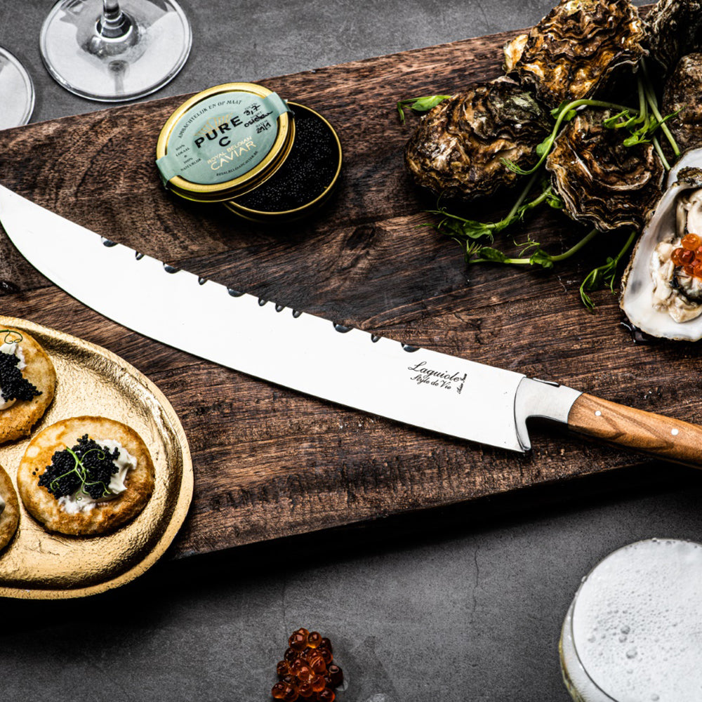 - Het lemmet is van RVS, het heft is van prachtig olijfhout