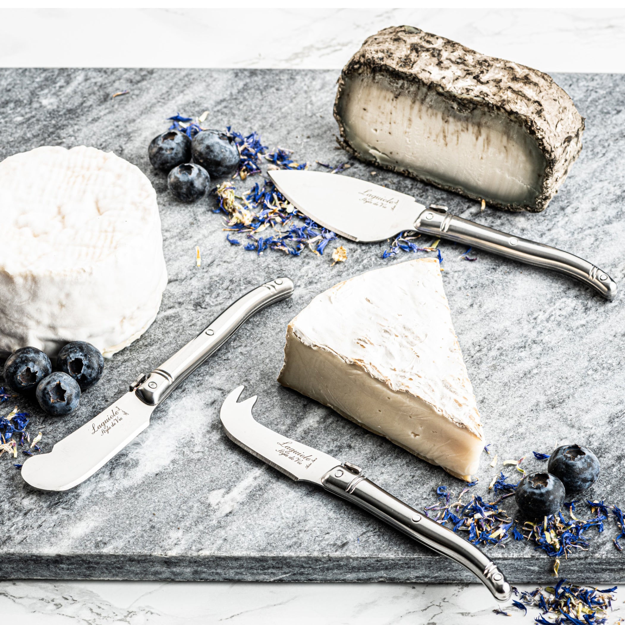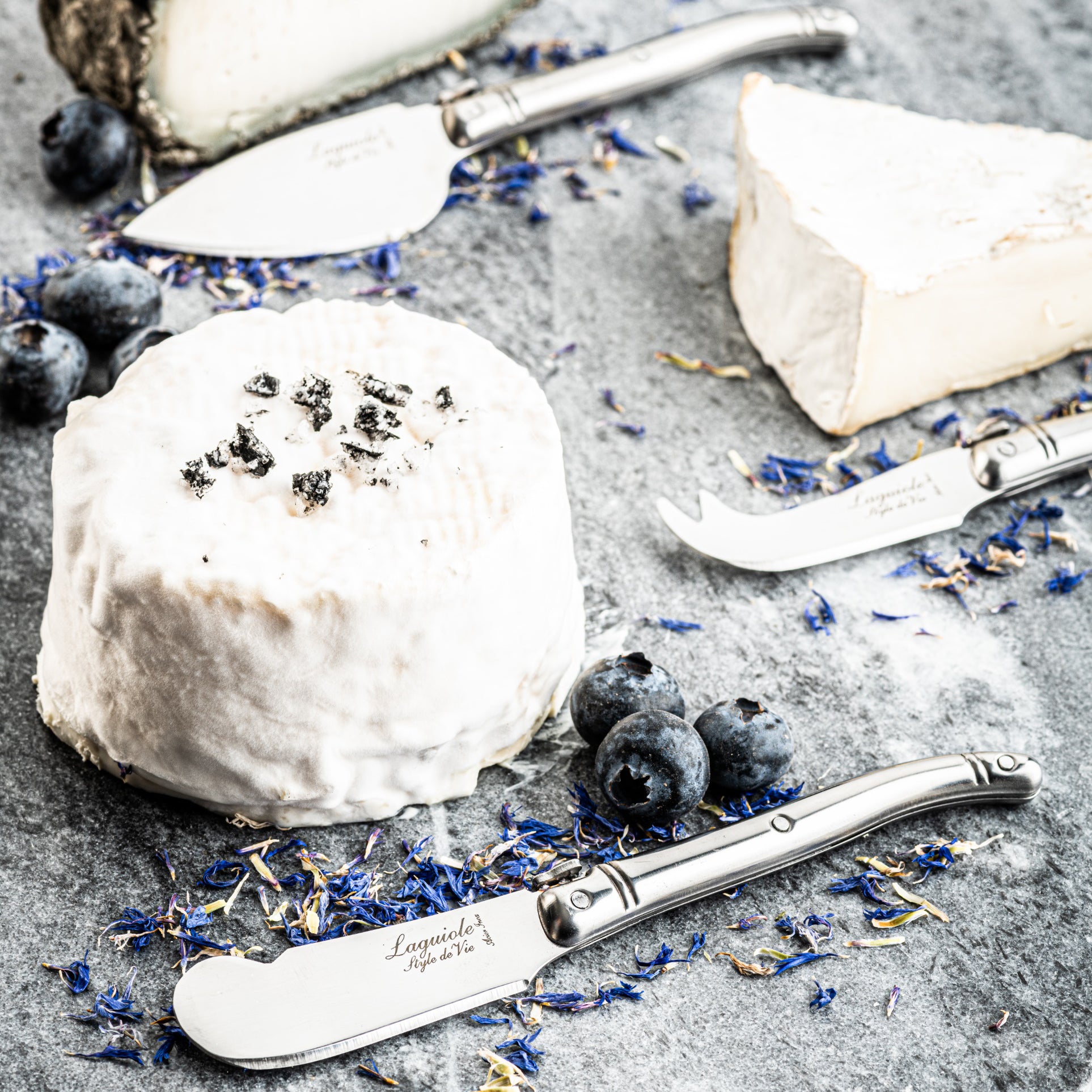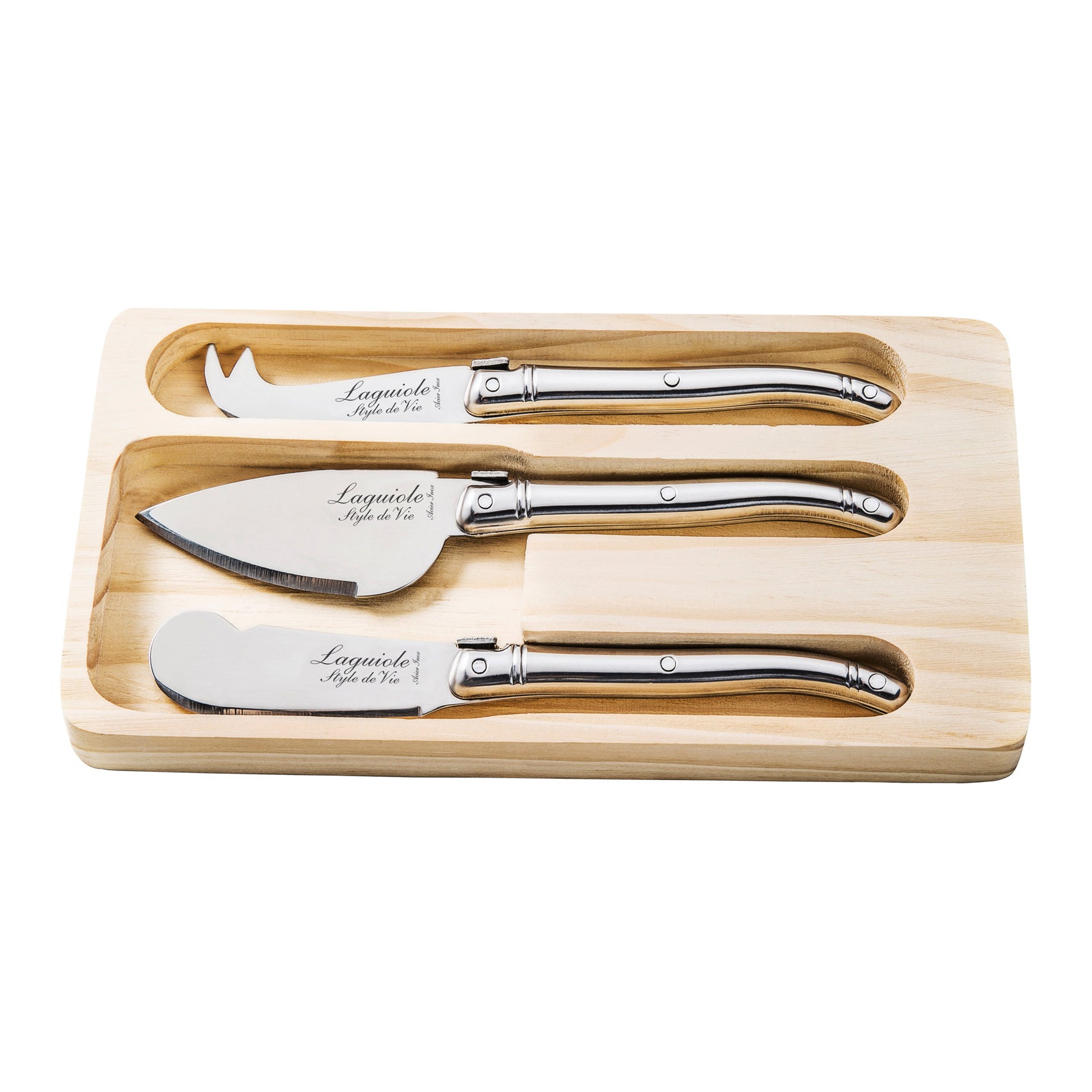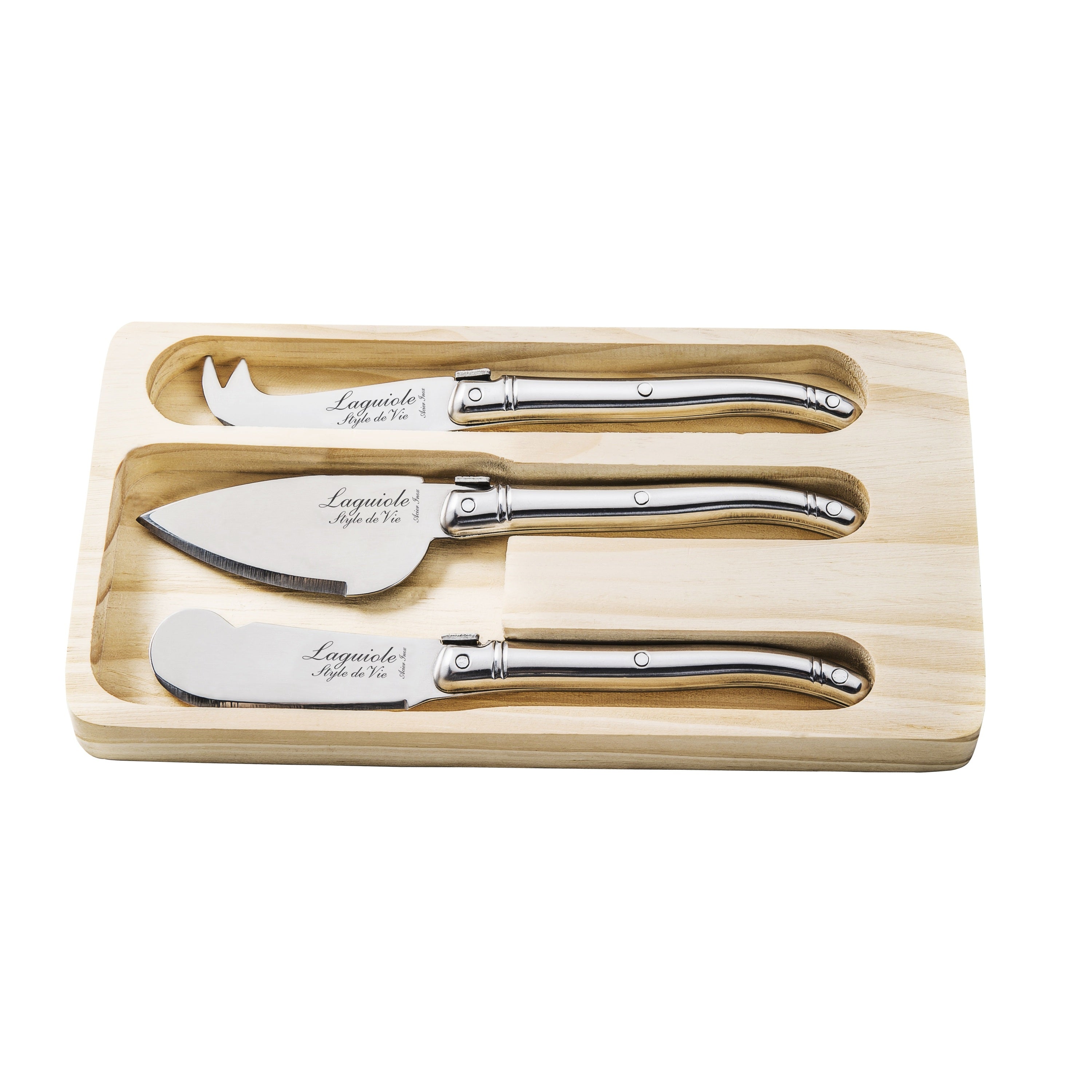 Laguiole Style de Vie Kaasmessenset Presenteer je kaasplankje in stijl met de juiste messen. Deze kaasmessenset van Laguiole Style de Vie bestaat uit drie mooie kaasmesjes voor verschillende soorten kazen. De kaasmessen worden geleverd in een handig houten kistje en hebben allemaal een glad lemmet met een dikte van 1,2 mm. De kaasmessen zijn vaatwasmachinebestendig.