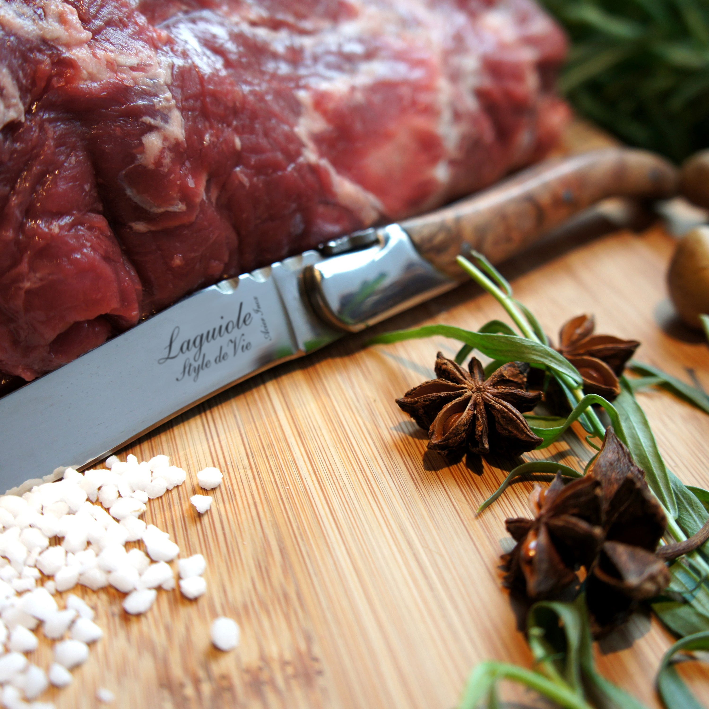 Chique steakmessen De steakmessen van Laguiole Style de Vie zijn gemaakt van hoogwaardige materialen die voor een luxe, elegante uitstraling zorgen. Doordat je de messen niet in de besteklade legt voorkom je beschadigingen. De messen hebben een roestvrijstalen lemmet van 2,5 mm dik. Met het gladde mes glijd je zo door je steak heen, waar een gekarteld mes blijft hangen achter de pezen in het vlees. Soepel snijden dus!