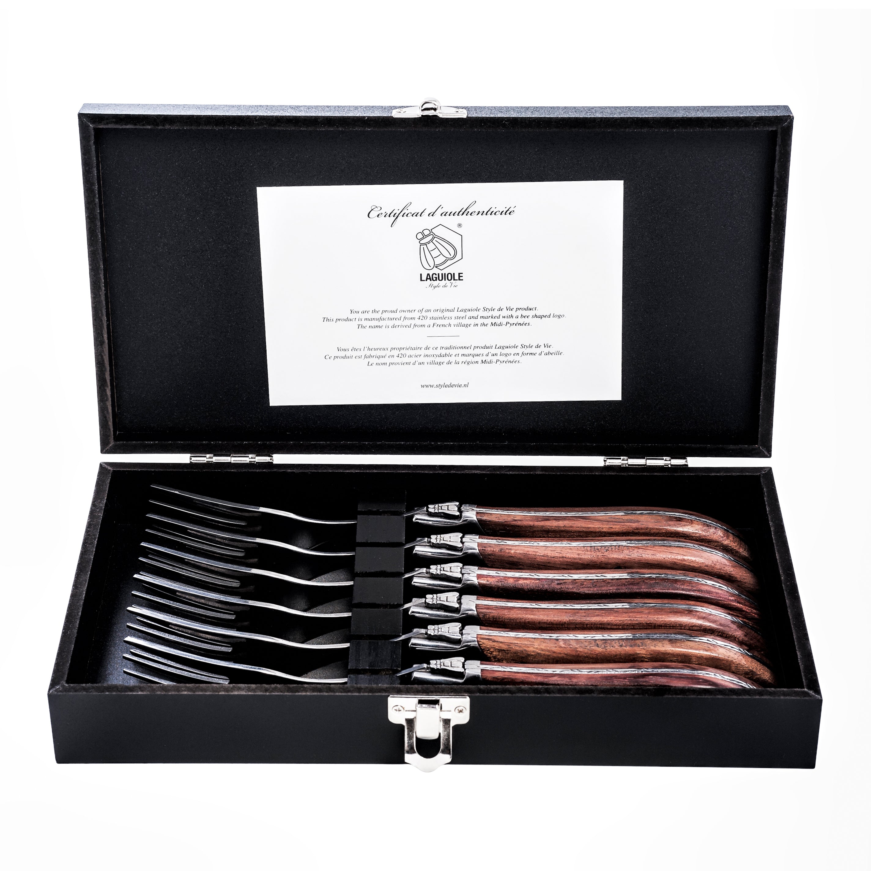 Mooi cadeau De vorken van Laguiole Style de Vie zijn gemaakt van hoogwaardige materialen die voor een luxe, elegante uitstraling zorgen. De vorken hebben een klassieke vormgeving met het opvallende logo van Laguiole Style de Vie op het heft. De vorkenset wordt geleverd in een mooi kistje waardoor de set gelijk een prachtig cadeau is.
