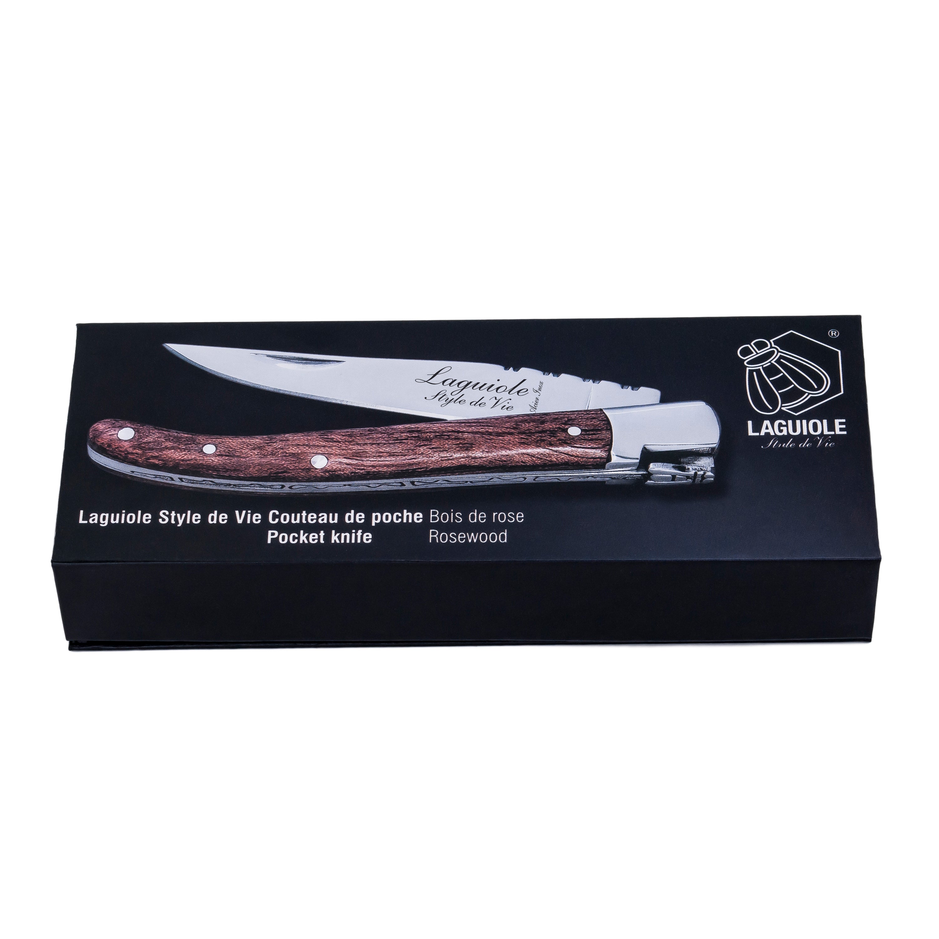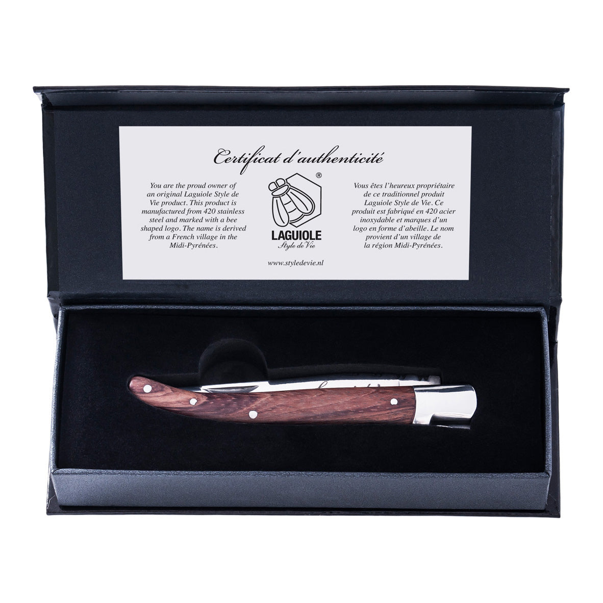 Style de Vie Laguiole zakmes Een zakmes is onmisbaar, zeker dit handzame exemplaar van Style de Vie! Het Laguiole zakmes heeft een scherp lemmet van 9 cm en is gemakkelijk in gebruik. Dankzij het ergonomisch vormgegeven houten heft ligt het mes prettig in de hand. Het zakmes wordt geleverd in een luxe giftbox inclusief echtheidscertificaat.