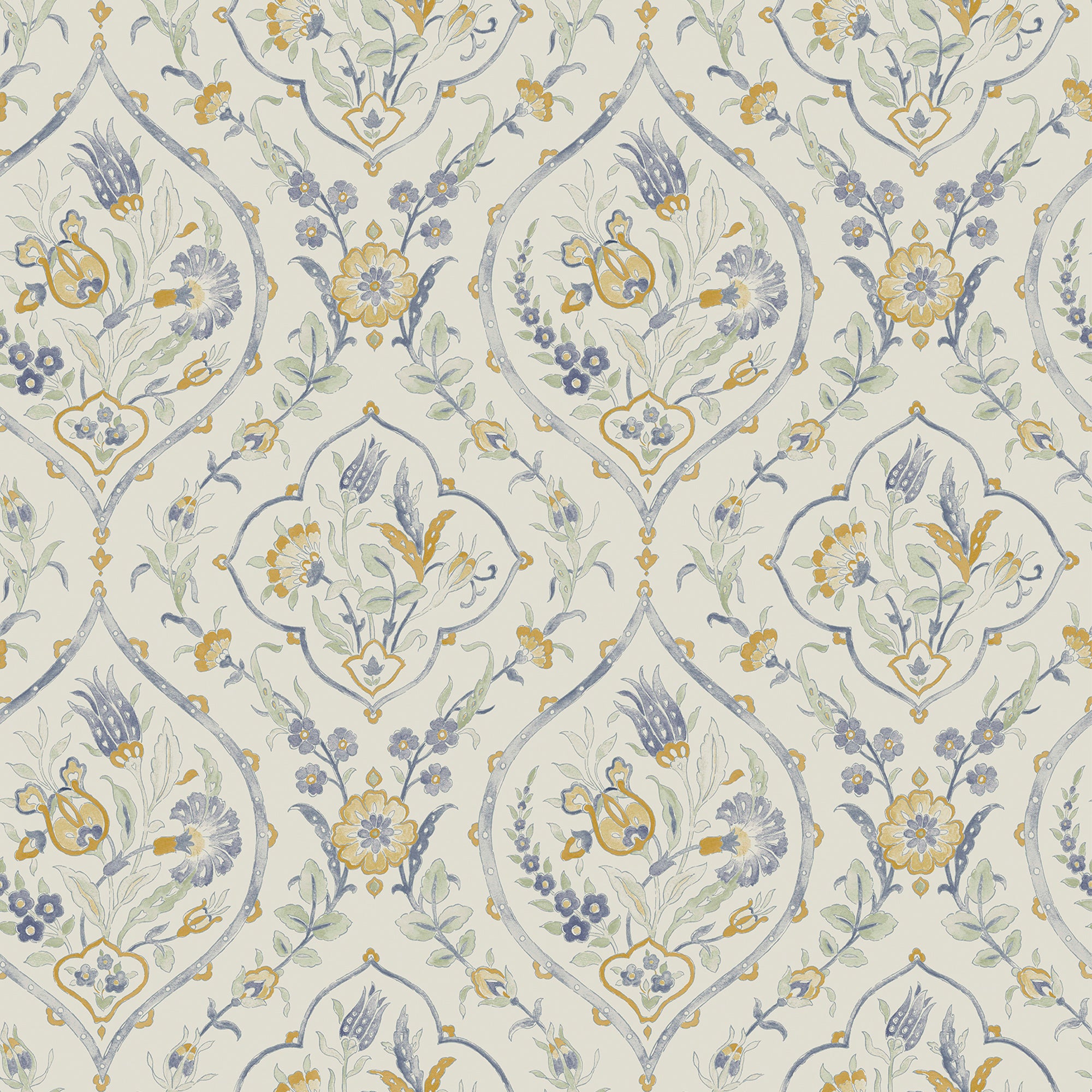 Deze abstracte damastprint is zacht en uitnodigend en heeft goudsbloemen en tulpenachtige bloemen in aquarelstijl.