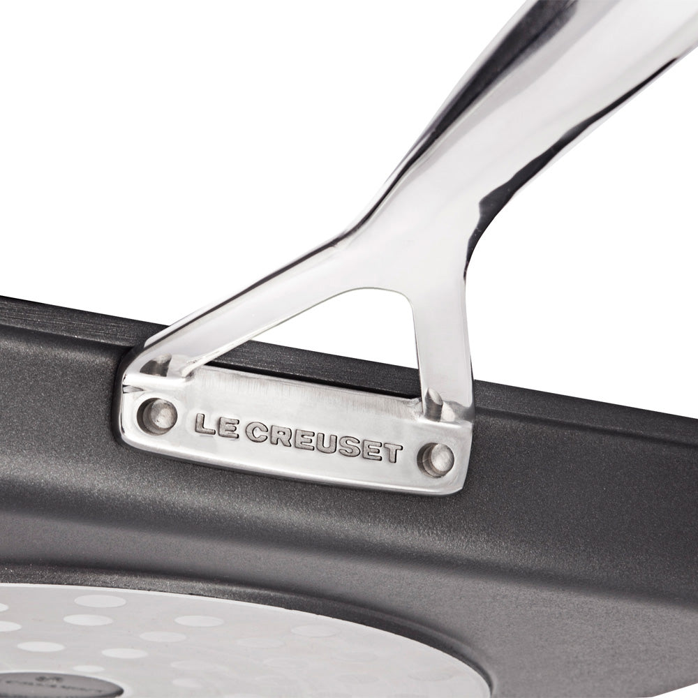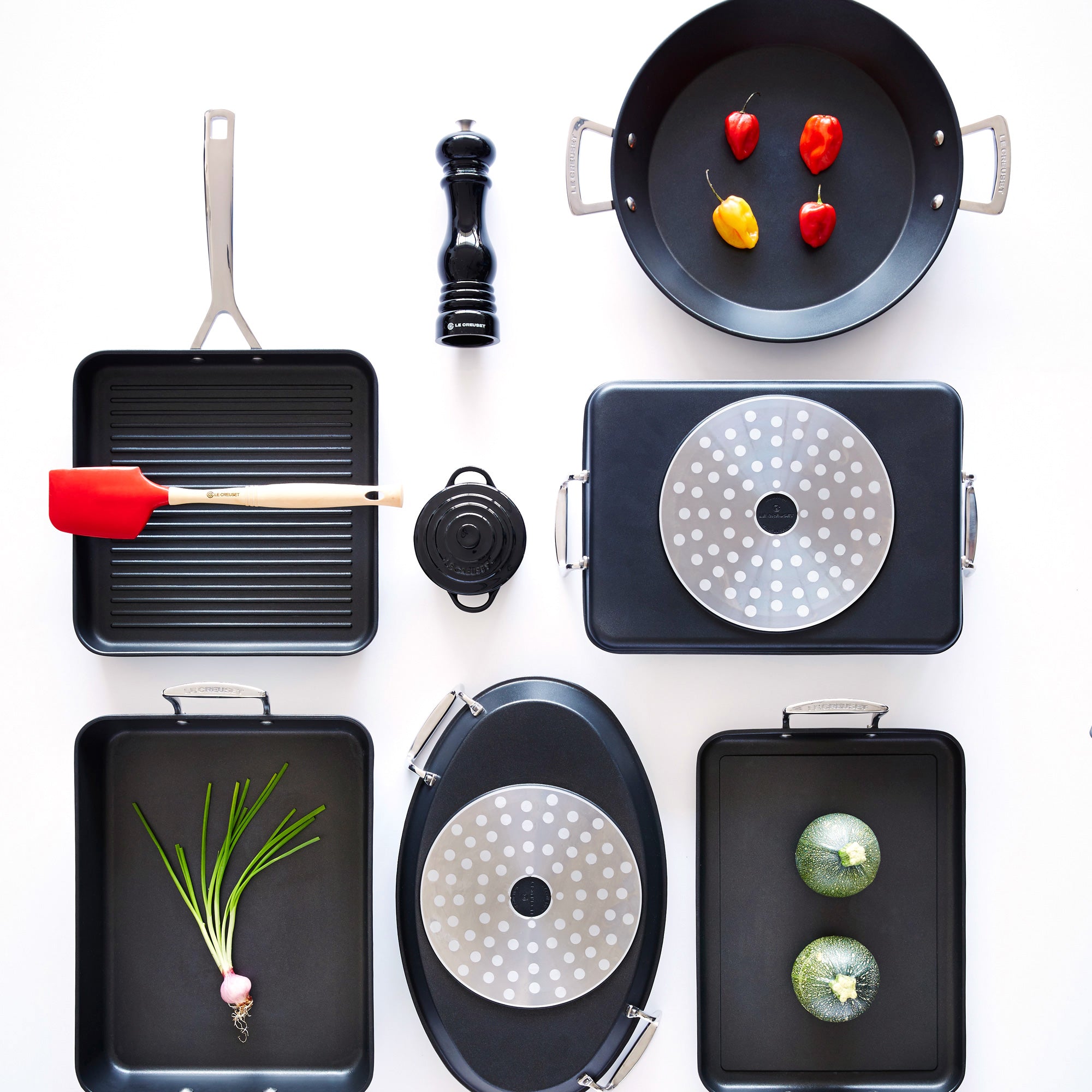 Le Creuset Grillpan Les Forgées De grillpan uit de Les Forgées serie van Le Creuset is gemaakt van gegoten aluminium. De pan is voorzien van een zeer sterke antiaanbaklaag die voldoet aan de strengste voedsel- en productvoorschriften. De antiaanbaklaag is zelfs veilig wanneer er per ongeluk in gekrast is.