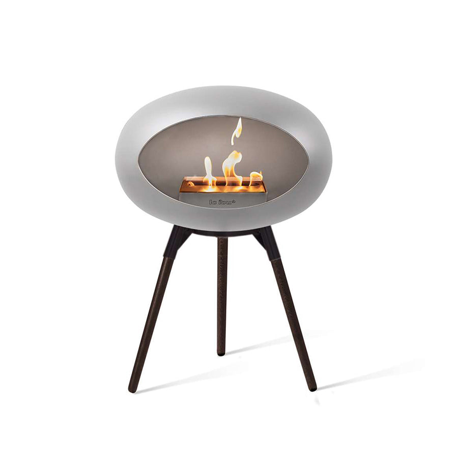 Het ‘tripod’ onderstel van Deens handbewerkt hardhout of exclusief Rose gold-staal geeft de elegante Le Feu Ground High een onderscheidende stijl, die de sfeervolle warmte van de koepel extra ondersteunt.