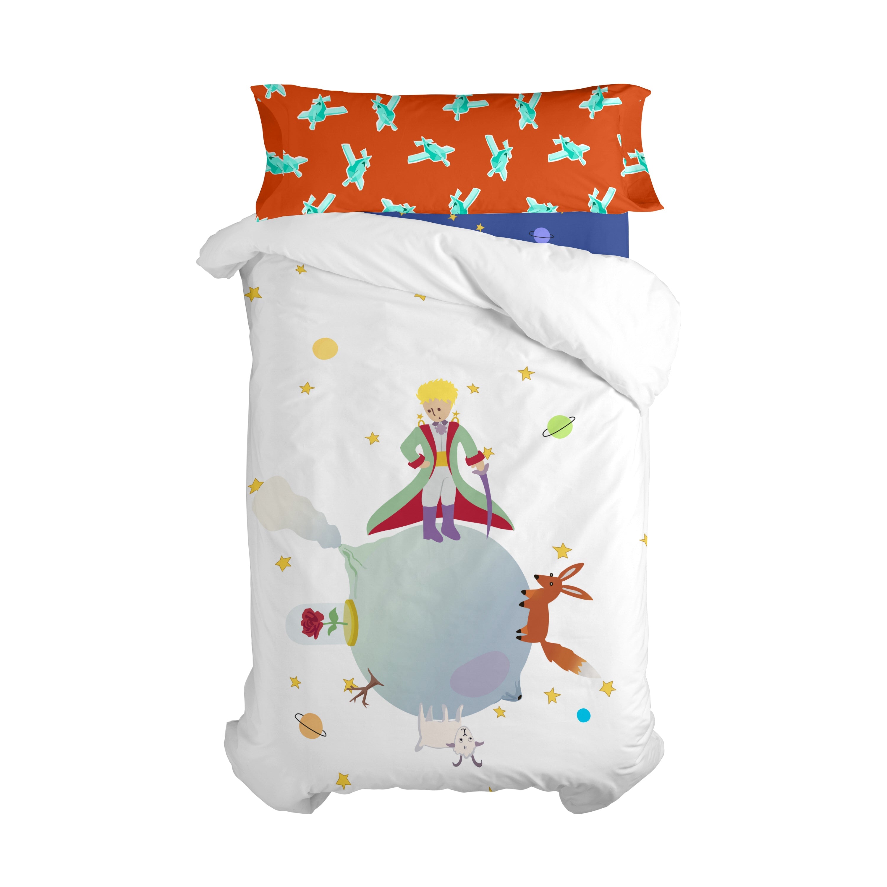 Laat het dekbedovertrek uit de Le Petit Prince collectie je kind betoveren met de fantasierijke avonturen van een vrolijke blonde jongen die op asteroïde 325 woont, een planeet kleiner dan een huis, met een prachtige bloeiende roos en actieve vulkanen. Dit magische dekbedovertrek van 100% katoen en 150 thread count geeft het een zachter, comfortabeler gevoel en bevat een decoratieve kussensloop met vliegende vliegtuigen om de look compleet te maken. Linnen niet inbegrepen