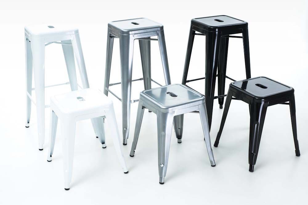 - In dezelfde serie verkrijgbaar: eetkamerstoelen, stoelen met armleuning, lage krukken (45 cm), krukken voor een bartafel (77 cm). Variaties met houten zitting of rugleuning