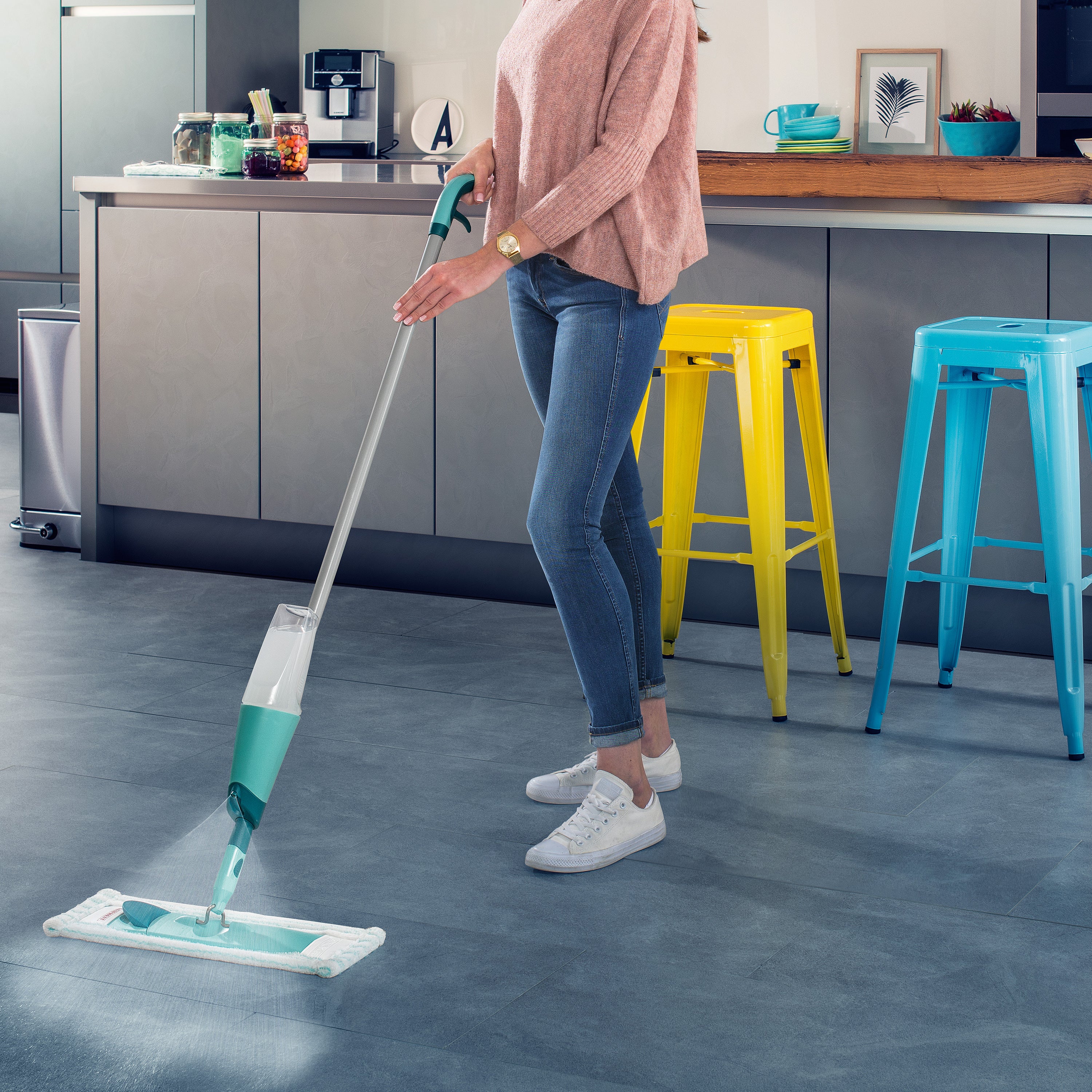 Vloerwisser De handige vloerwisser is eenvoudig in gebruik. De 42 cm brede dweil draait 360 graden, waardoor je ook gemakkelijk rond stoel- en tafelpoten dweilt. Bovendien kun je de steel plat neerklappen, waardoor je ook eenvoudig onder je meubels komt. Bevestig de Leifheit Care of Protect spray aan de steel en knijp de hendel om te sprayen. De vloerwisser geeft gelijkmatig en gedoseerd de vloeistof af voor de dweil zodat je dit direct kunt inboenen. Je kunt de tank ook vullen met een zelfgemaakt sopje. Wat is het verschil tussen de verzorgingsmaterialen?