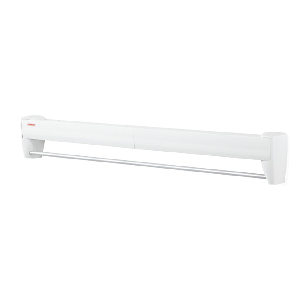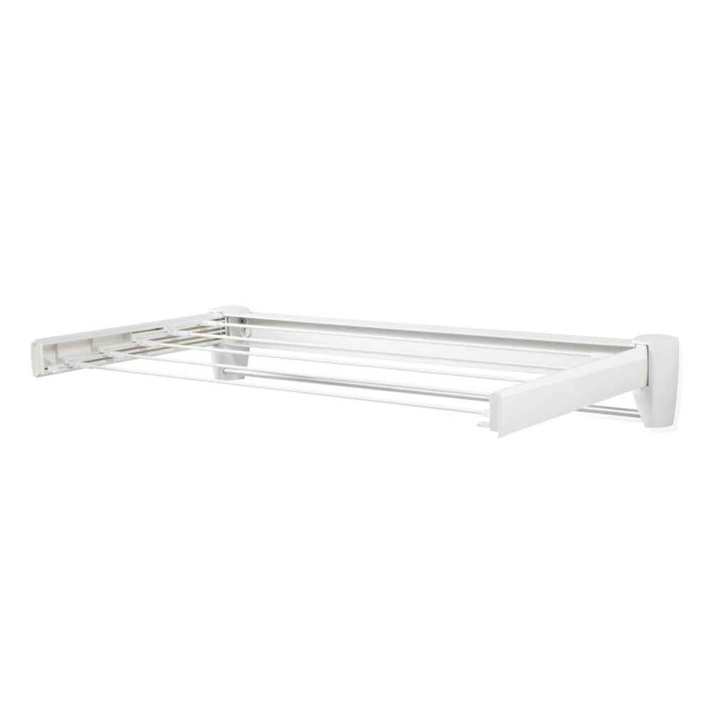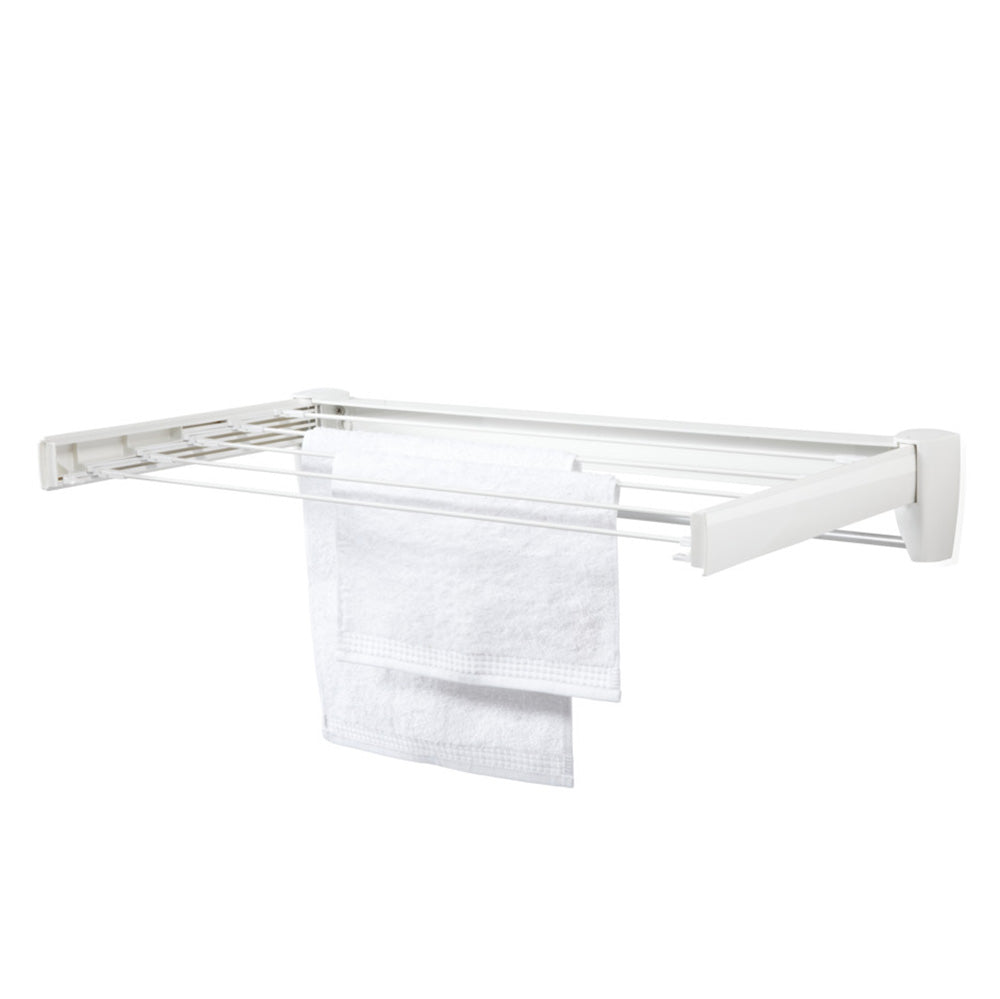 Inklapbaar Wanneer het droogrek ingeklapt is, is het droogrek amper zichtbaar en neemt het weinig ruimte in beslag. Het droogrekje is voorzien van een handdoekstang die te gebruiken is wanneer het droogrek geopend en gesloten is.