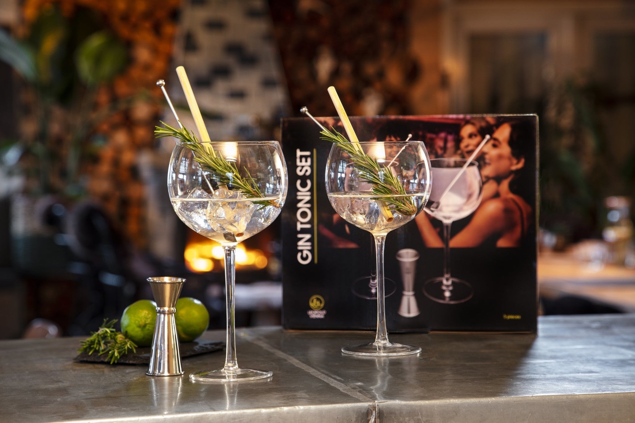 - 5-delige set; 2 glazen, barmaatje en 2 roerlepels