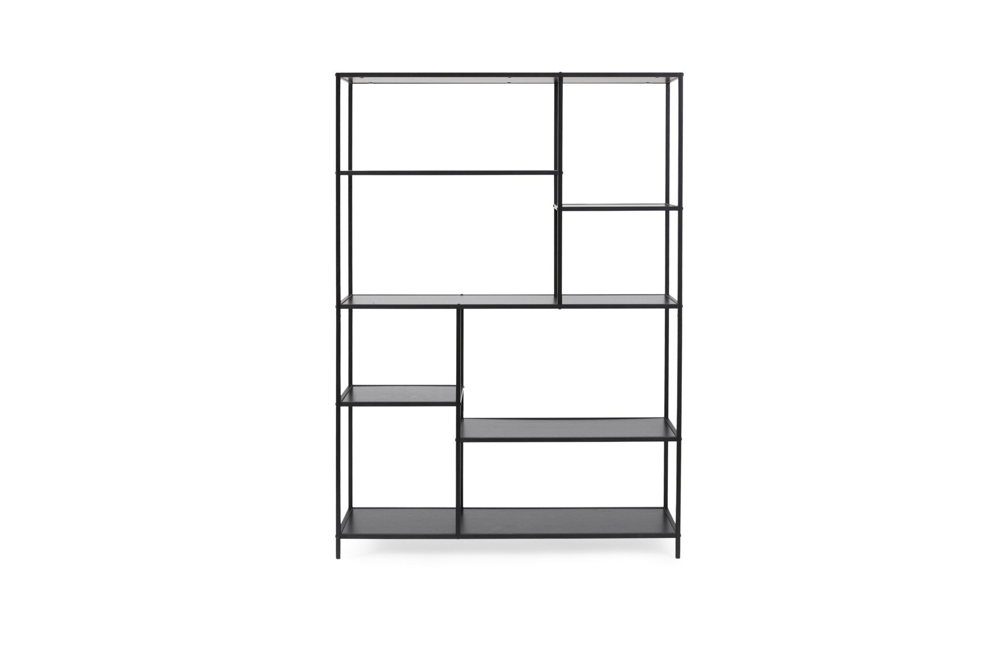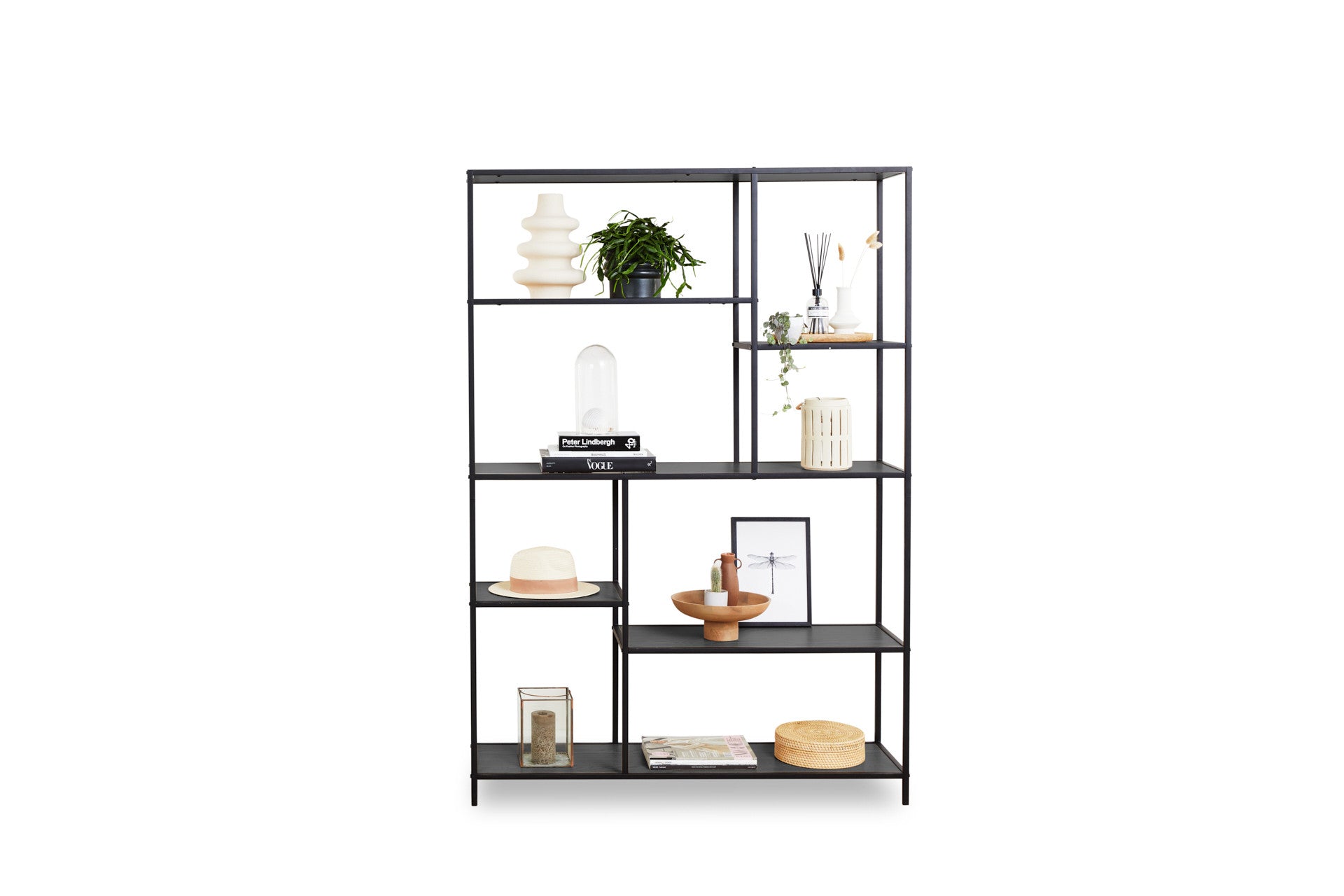 - De open wandkast heeft een zwart metalen frame en zwart afgewerkte planken van MDF.