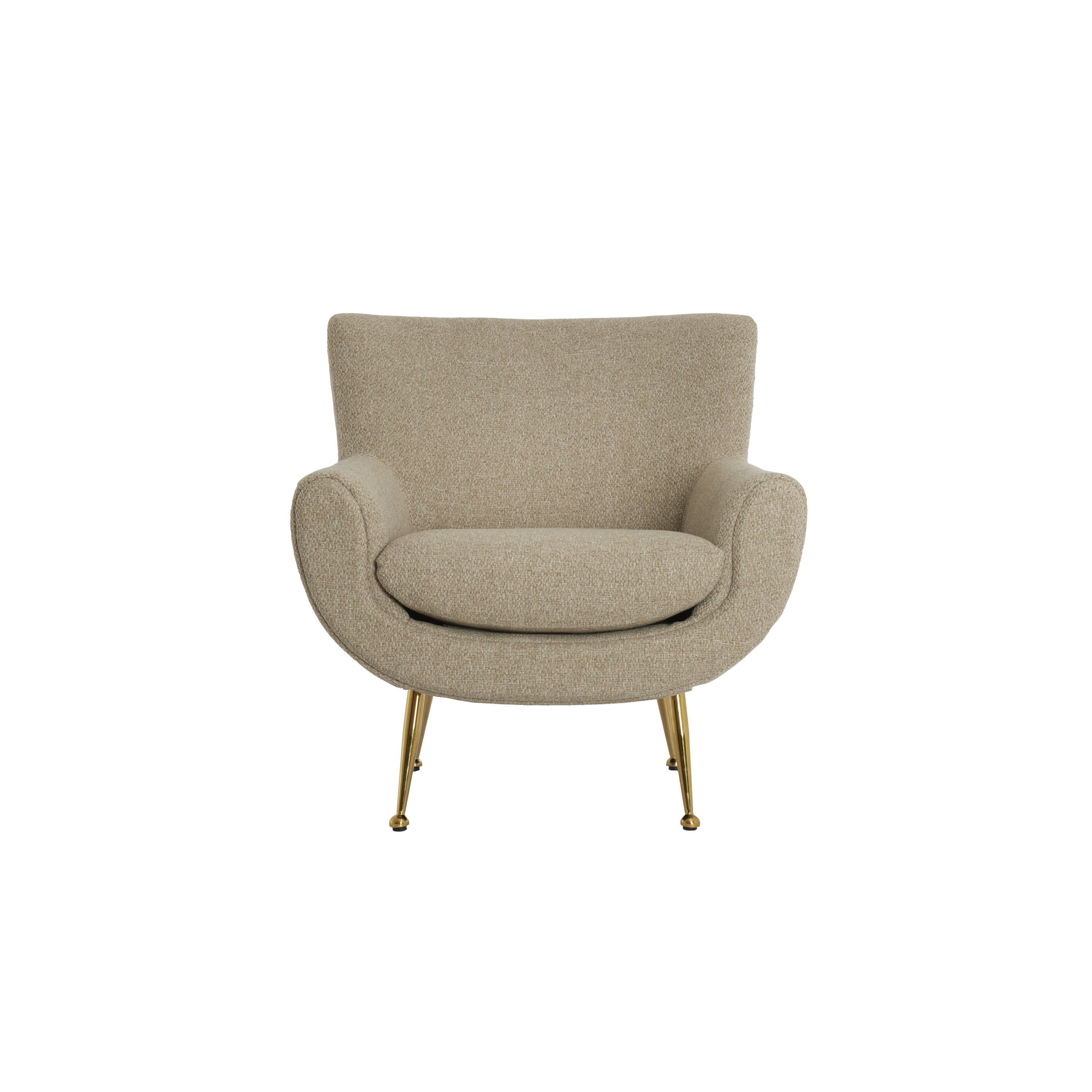 De combinatie van een zachte beige bekleding met gouden details geeft de stoel een elegante en stijlvolle uitstraling die een luxe sfeer toevoegt aan iedere ruimte.