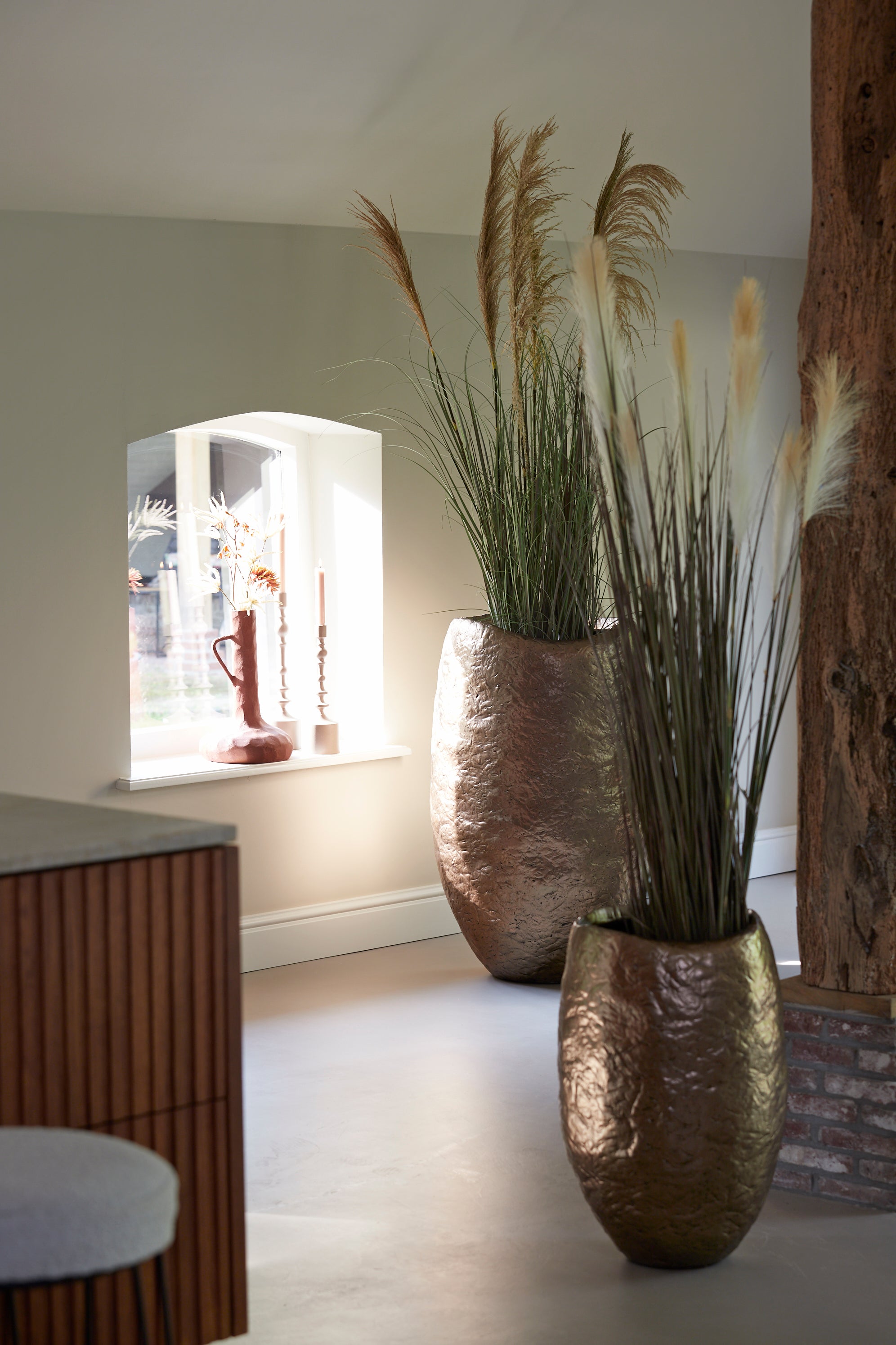 Met een diameter van 39 cm en een hoogte van 58 cm biedt de TINGRI vaas voldoende ruimte voor een weelderig boeket of een stijlvolle decoratie. De brede opening maakt het eenvoudig om bloemen of takken op een elegante manier te schikken. Ook zonder bloemen is de vaas op zichzelf een prachtig decoratief element dat de ruimte verrijkt met zijn rijke, bronzen kleur en opvallende ontwerp.
