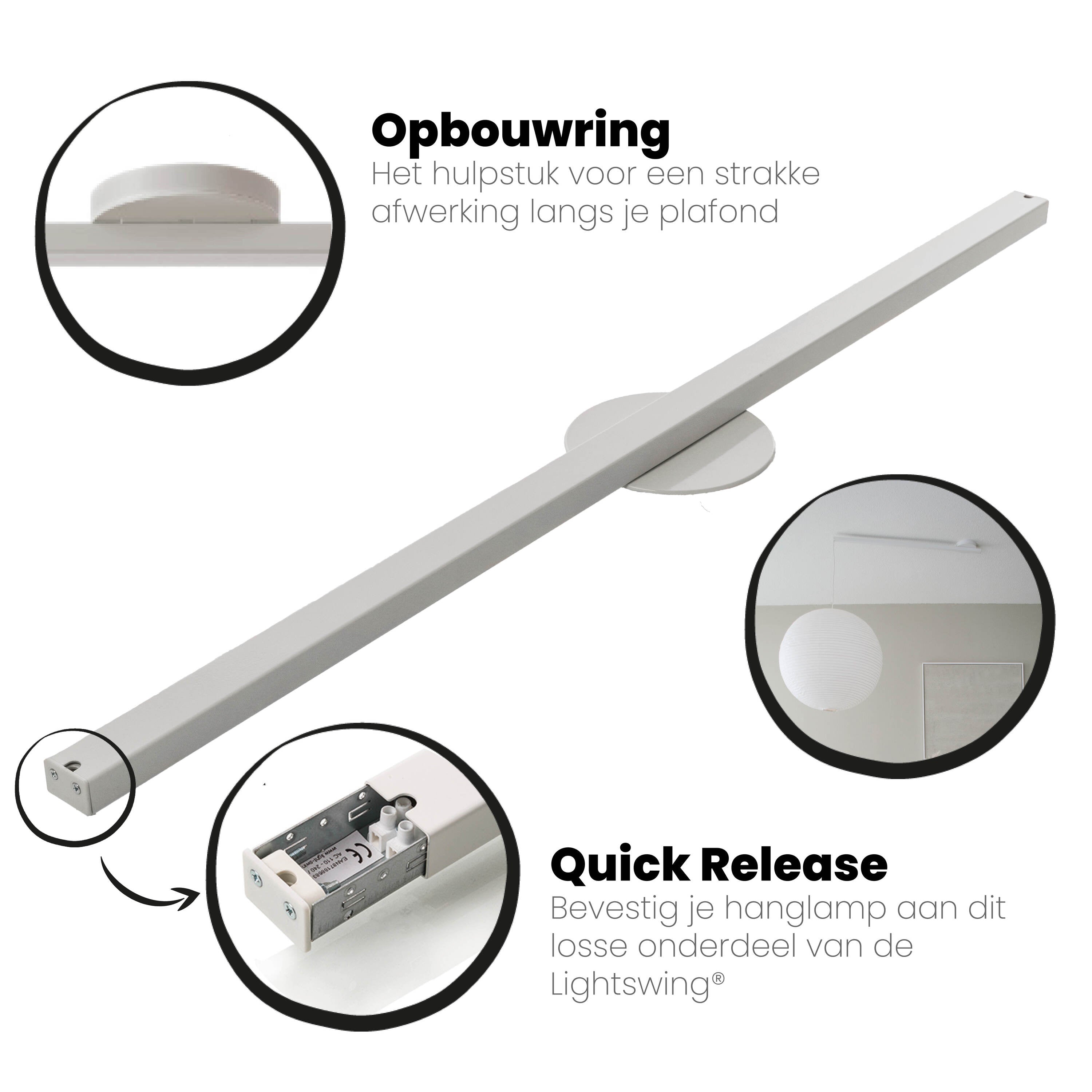 Twee hanglampen ophangen gaat in een handomdraai met de Lightswing Twin mat wit 110cm. Je bevestigt de Lightswing Twin over de centraaldoos of op een andere plek die bereikbaar is voor een elektriciteitskabel. Vanaf dit punt kan de mat zwarte Lightswing Twin 360° draaien en 90 cm schuiven. De lampen bevestig je aan de Quick Releases, twee losse onderdelen die je in en uit de Lightswing kunt schuiven. De Lightswing zorgt voor een mooie afwerking en voorkomt loshangende draden of onnodige boorgaten.