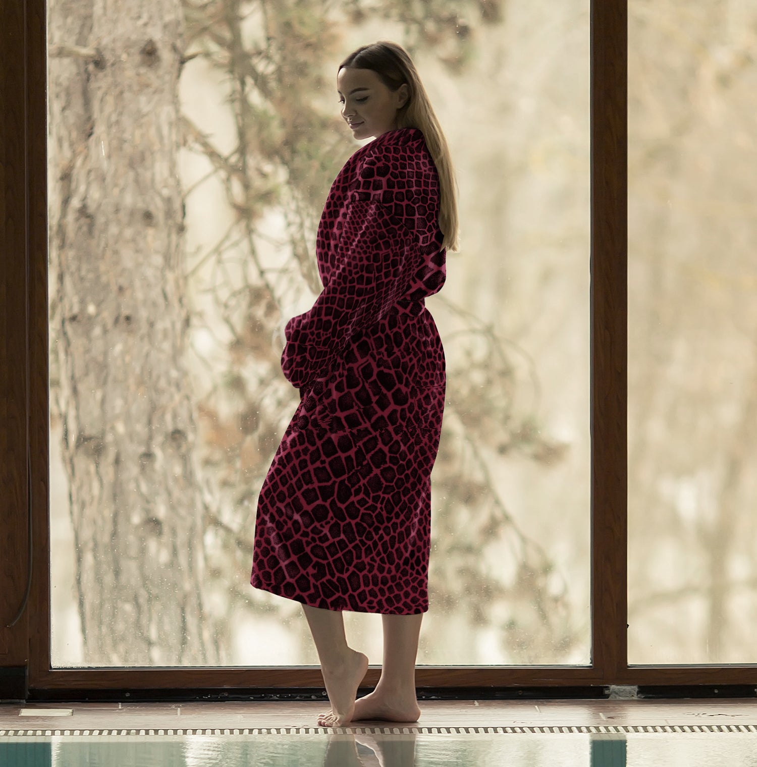 Op zoek naar een knusse badjas die er ook nog eens trendy uitziet? Deze lange fleece badjas van LINNICK in slangenprint is precies wat je nodig hebt. Heerlijk zacht en warm, perfect voor een relaxed dagje thuis, na een douche of tijdens een saunabezoek.