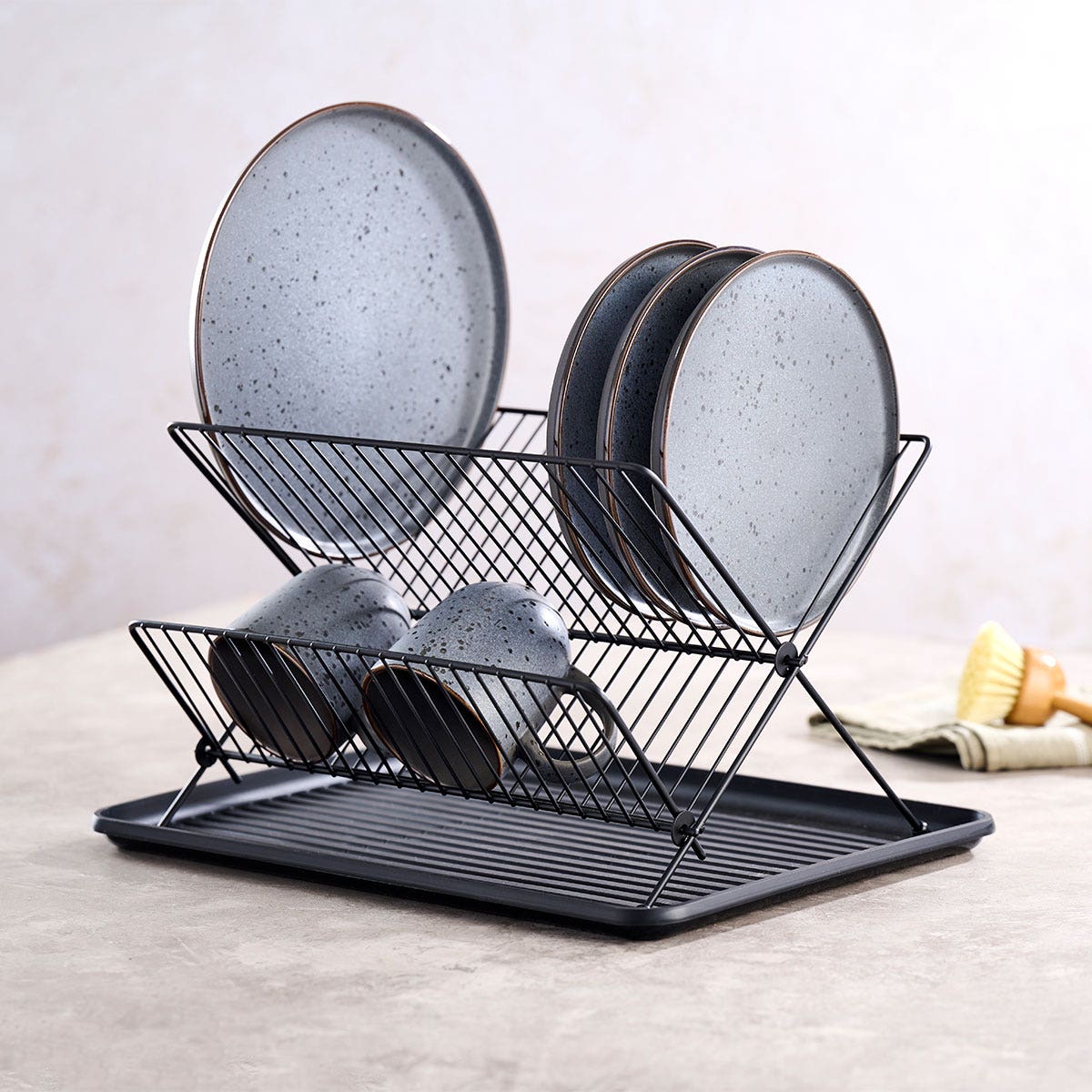 Met het Demi afdruiprek kun je stijlvol je natte vaat laten drogen. Met zijn twee droogrekken heeft dit metalen afdruiprek voldoende plek voor borden, mokken en bestek. Het rek wordt geleverd met een plastic onder tray zodat het rek niet wegschuift en je gehele aanrecht onder water loopt.