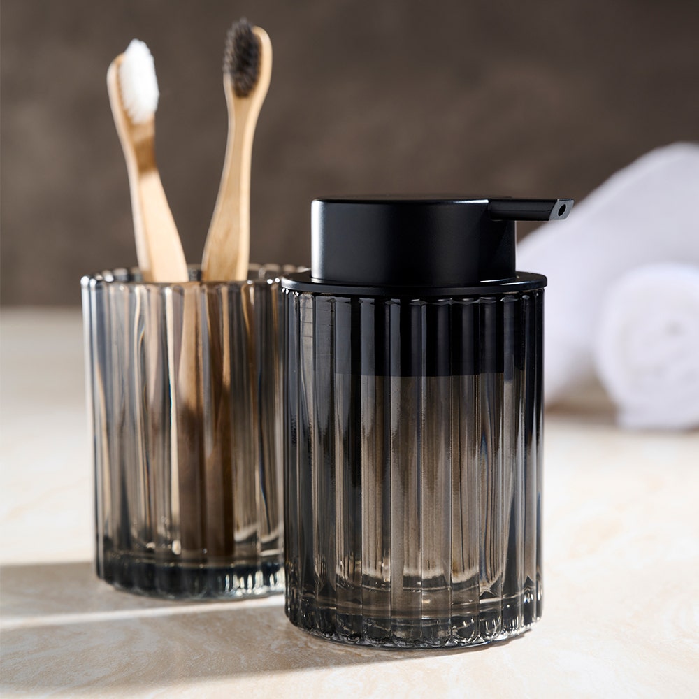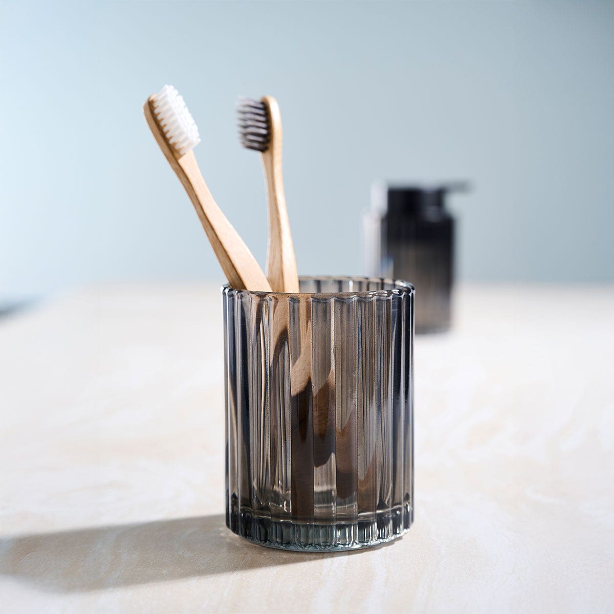 De Lian tandenborstel beker is gemaakt van glas en heeft een zwarte kleur. Het geribbelde glas zorgt voor een opvallende en chique uitstraling op de wastafel. De beker heeft een diameter van 7,5 cm en een hoogte van 10 cm. Combineer met de Lian zeepdispenser voor een bijpassende set badkameraccessoires.