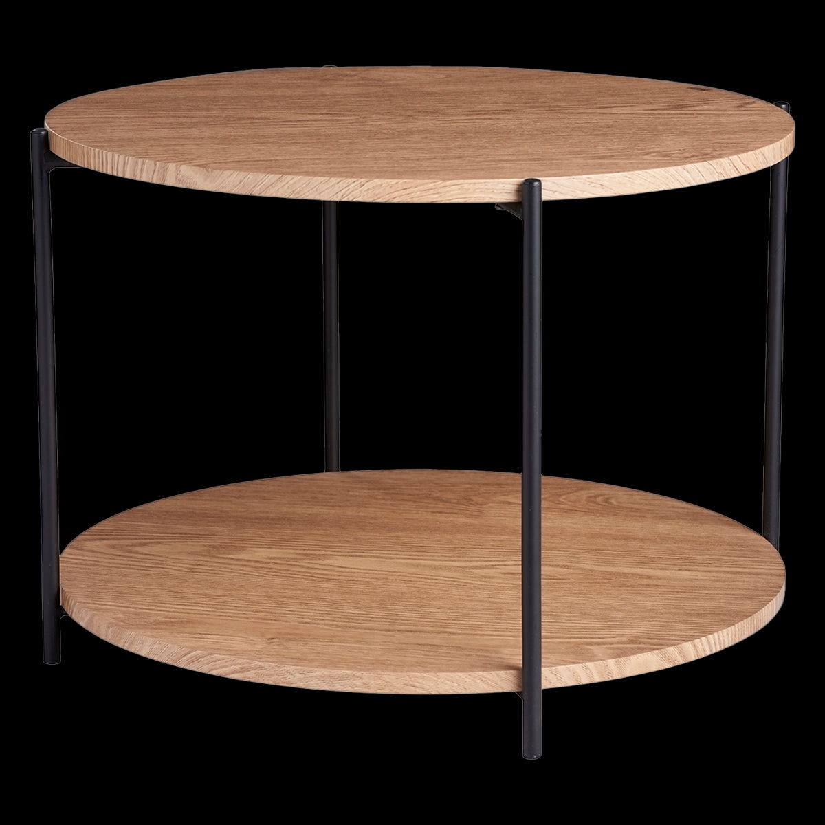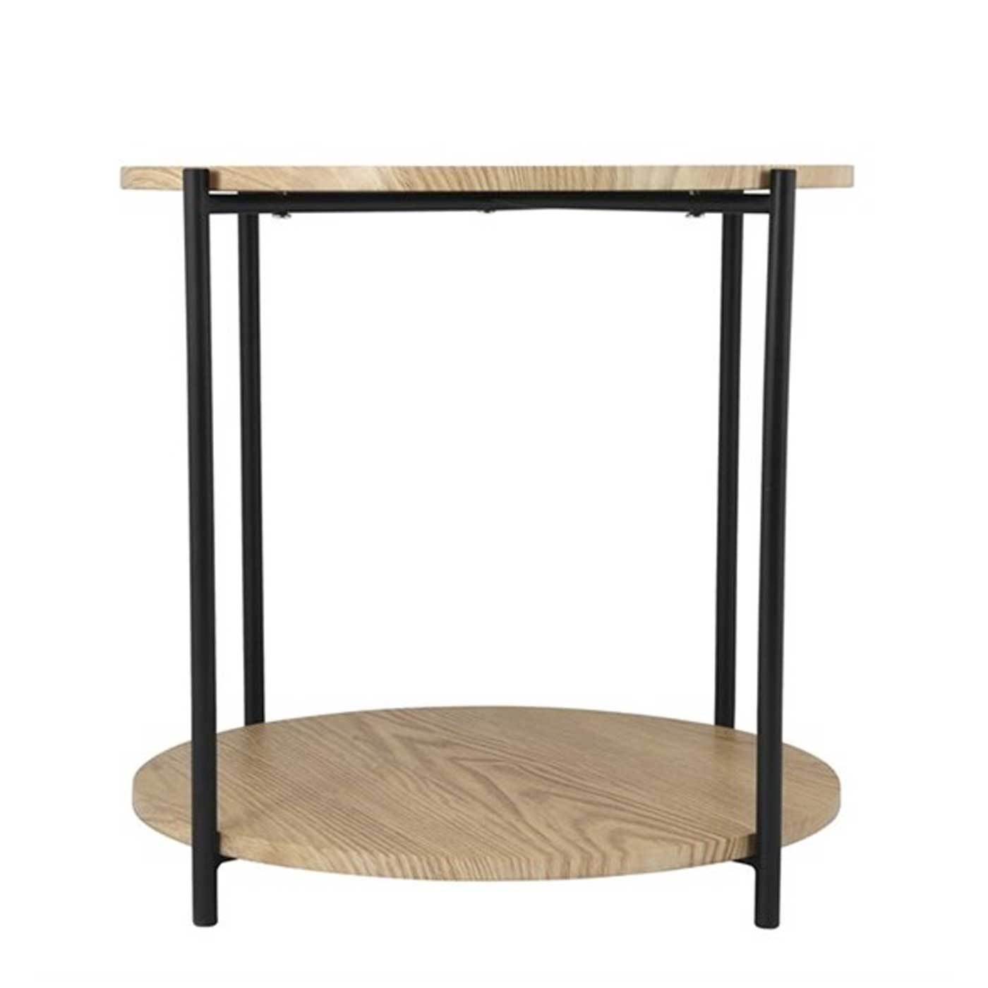 De tafel bestaat uit twee lagen met beide een diameter van 55 cm. Het zwarte metaal in combinatie met de houten bladen geeft de tafel een industriële uitstraling. Op de onderste laag kun je spullen als tijdschriften en afstandsbedieningen kwijt, waardoor je het bovenste blad vrij houdt voor servies of mooie accessoires. Bovendien is de tafel leuk om te combineren met andere tafeltjes, zoals de Lina bijzettafel.