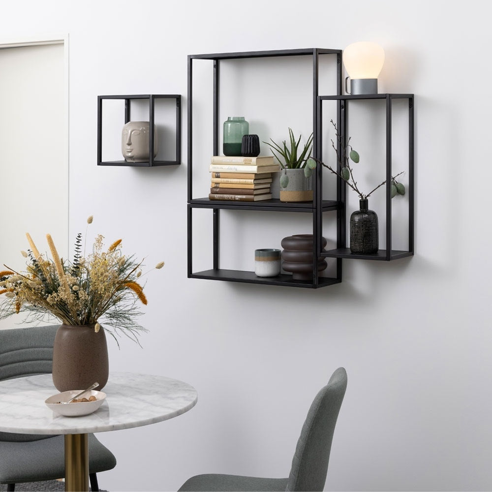 De wandrekken zijn volledig gemaakt van zwart metaal en hebben verschillende afmetingen: L60 x H60 x D20 cm, L30 x H60 x D20 cm, L30 x H60 x D20 cm en L30 x H30 x D20 cm. De metalen schappen kun je allemaal los van elkaar ophangen, dus je kiest zelf in welke vorm ze aan de muur komen te hangen: een strakke look met de schappen netjes naast elkaar, of juist een speelse look met de wandrekken op verschillende hoogtes. Dit wandrek is handig als je geen plek hebt voor een open boekenkast of als je een kale muur hebt in huis. Vul de rekjes met leuke accessoires en jouw muur is versierd!