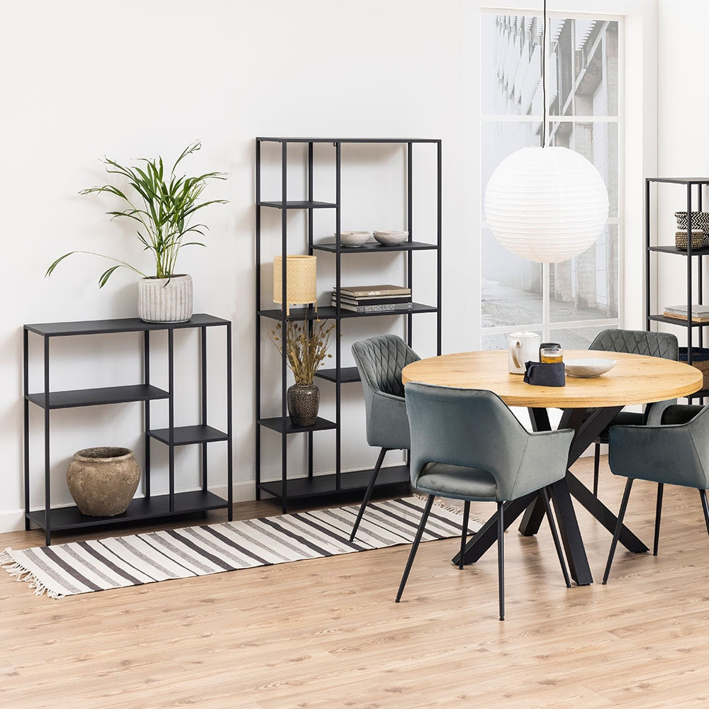 De Roy boekenkast heeft vijf planken en is 165 cm hoog. Het design van de open kast is voorzien van meerdere vakken die op een leuke speelse manier asymmetrisch zijn ingedeeld. Deze prachtige metalen boekenkast past in verschillende woonstijlen en daardoor in bijna ieder interieur. Doordat het metalen frame is afgewerkt met een poedercoating krijgt deze kast een industriële sfeer. Dankzij de vijf planken is er genoeg ruimte ontstaan om al jouw accessoires neer te zetten. Kortom, wanneer je op zoek bent naar een industriële open kast, dan is deze kast perfect voor jou!