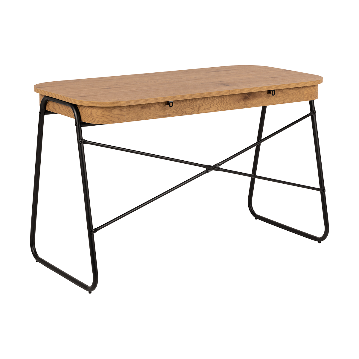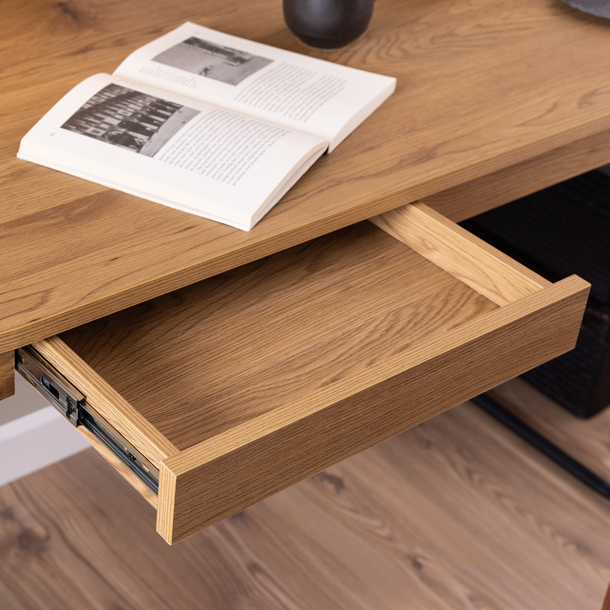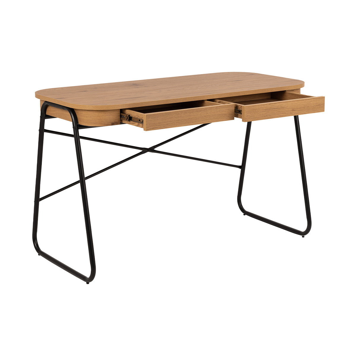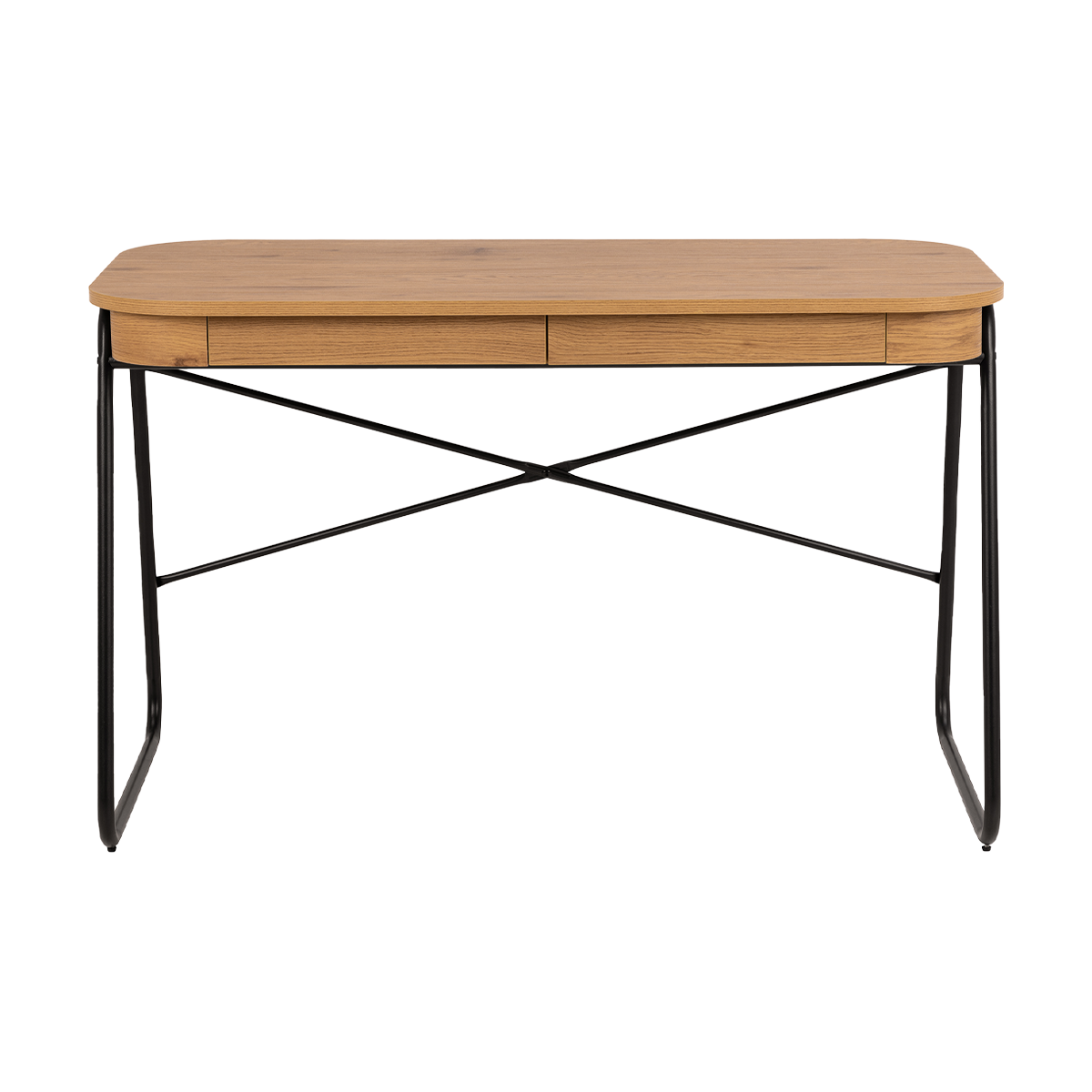 Dit houten bureau heeft een natuurlijke afwerking die een warme, tijdloze uitstraling aan elke kamer geeft. Met zijn industriële ontwerp en stevige zwarte poten voegt het een stoer en modern element toe aan je interieur. Met een afmeting van 120 x 60 cm is dit bureau ideaal voor kleinere ruimtes. Daarnaast heeft het bureau voldoende opbergruimte dankzij zijn twee ruime lades, ideaal om je kantoorbenodigdheden, papieren en andere spullen netjes op te bergen. De combinatie van natuurlijk hout en zwarte metalen poten zorgt voor een stijlvolle, industriële look die in zowel moderne als klassieke interieurs past.