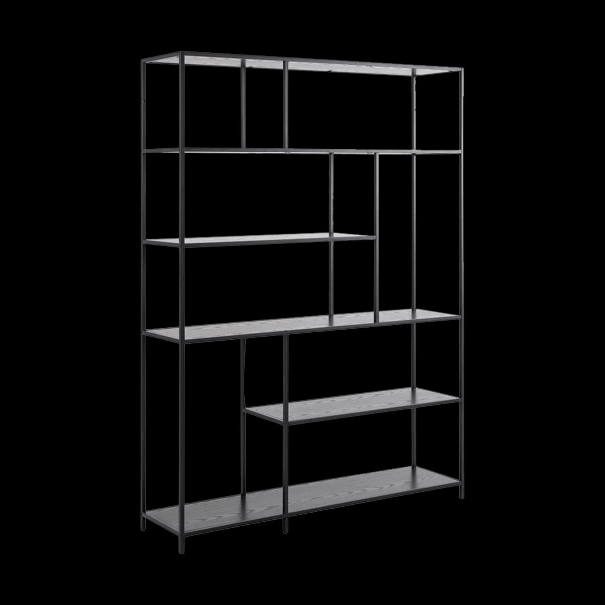 Het frame van deze kast is gemaakt van zwart metaal en de planken zijn gemaakt van hout en afgewerkt met een laagje fineer. Deze open boekenkast heeft vijf planken die op een speelse manier zijn ingedeeld, waardoor alle vakken van verschillende grootte zijn. Het imposante formaat en de industriële look van Vic zorgen ervoor dat de aandacht direct naar deze grote boekenkast wordt getrokken. Vul de planken met leuke boeken, accessoires of planten en je hebt een mooie blikvanger in huis. Mooie spullen mogen gezien worden, dus show ze in deze houten boekenkast van Lisomme.