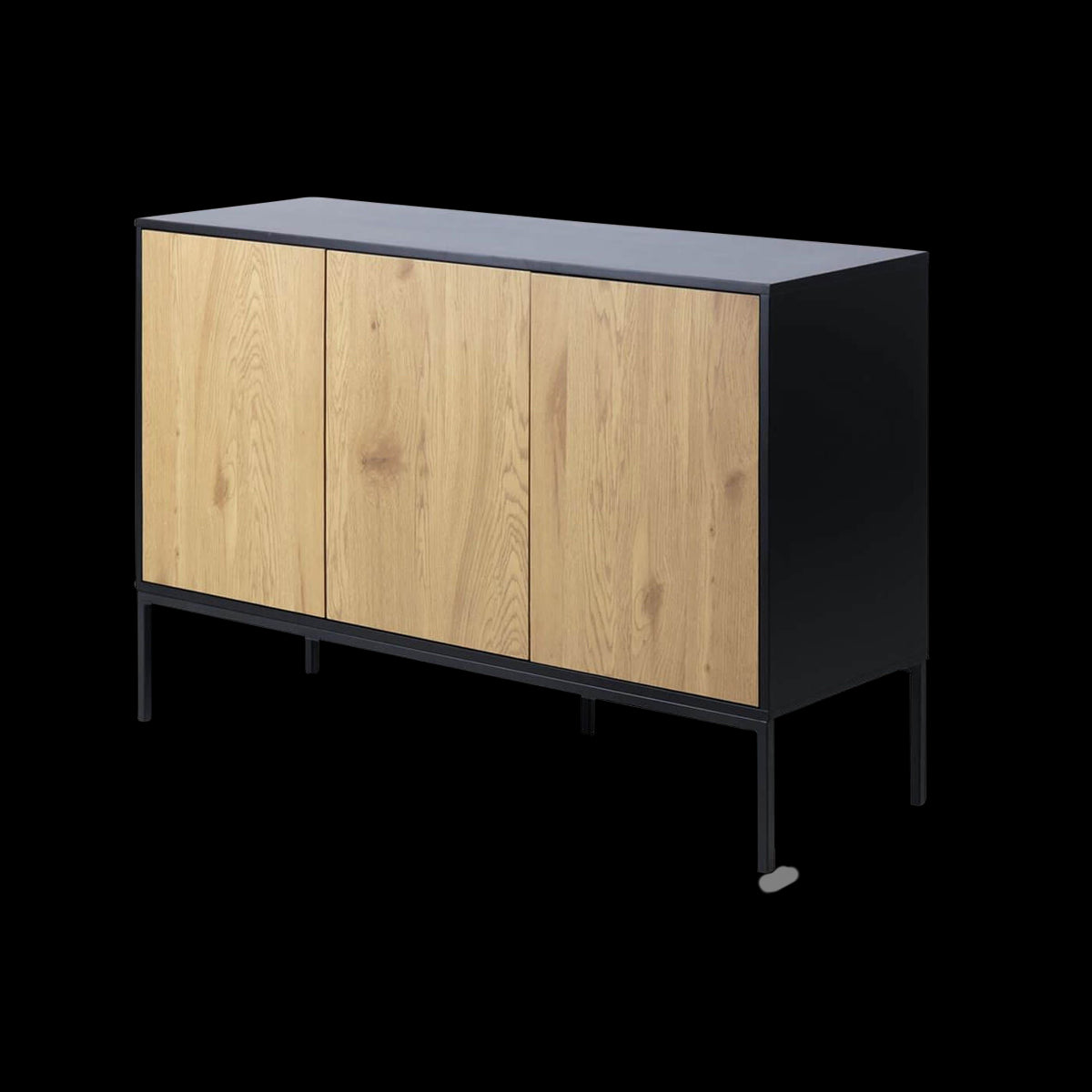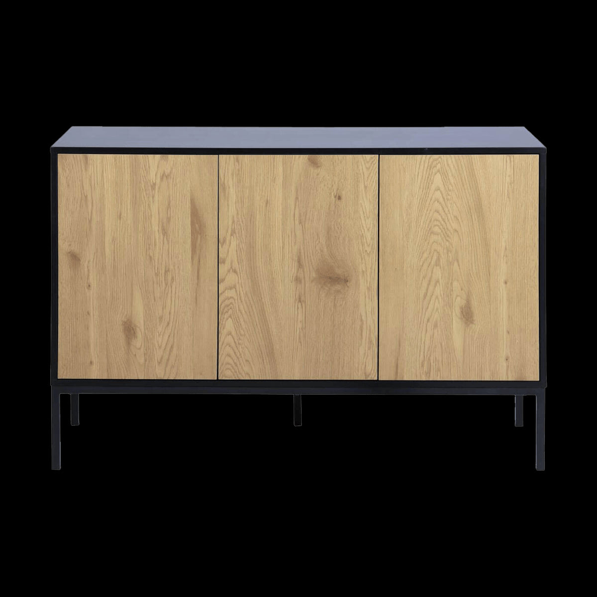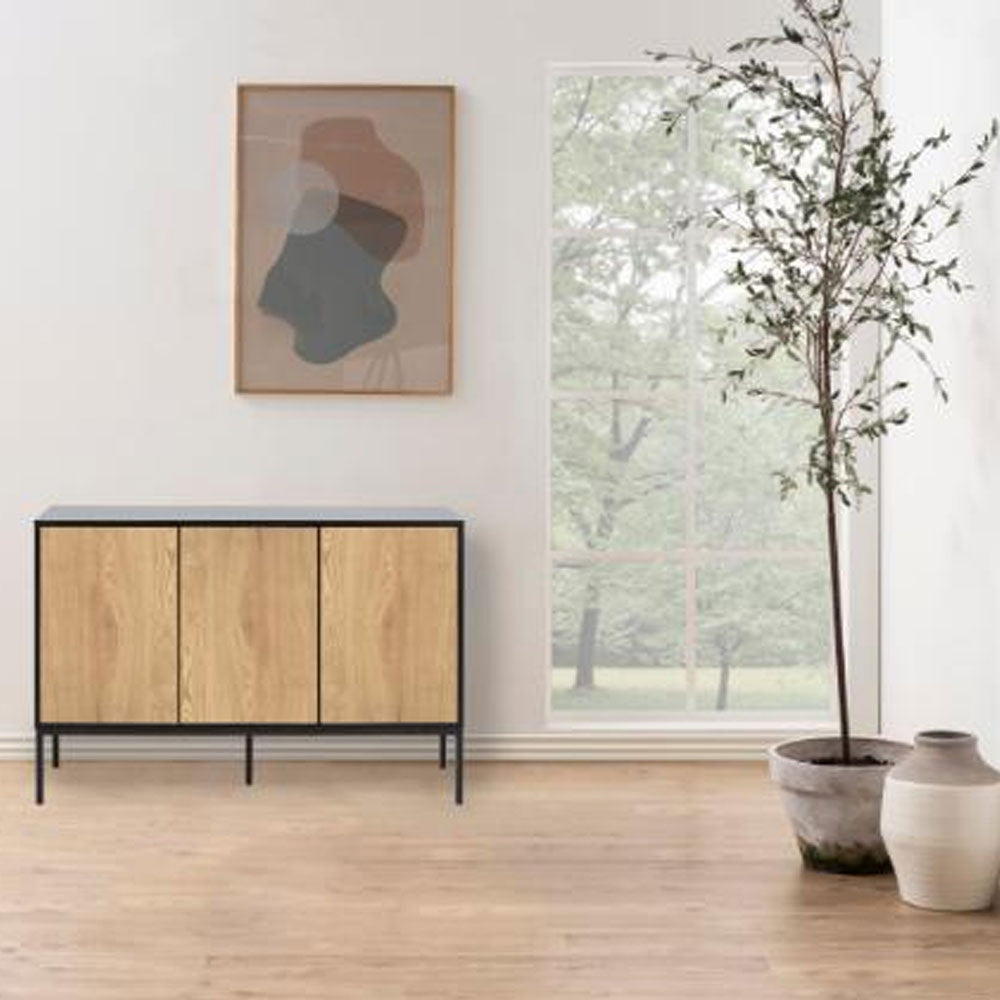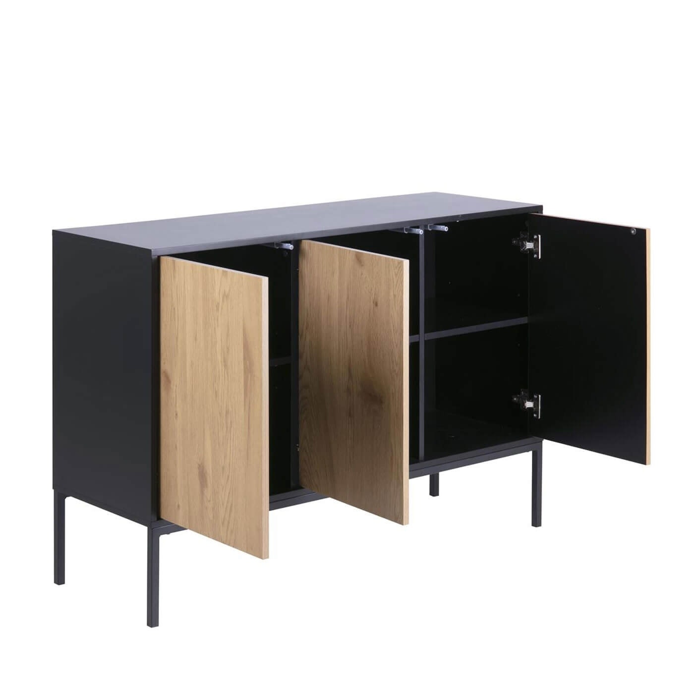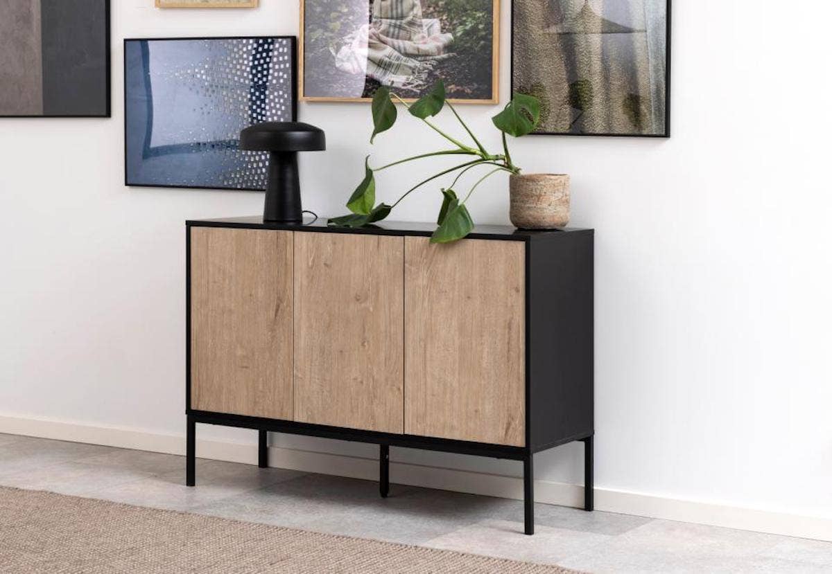 De kast heeft drie deuren met achter ieder deurtje een legplank. Zo biedt de kast voldoende ruimte om al je spullen netjes op te bergen. Zo heb je geen last meer van rondslingerende items in huis. Met het industriële sideboard Vic tover je een kale muur in een handomdraai om in een ware blikvanger in de kamer. Boven de kast is er nog voldoende ruimte om bijvoorbeeld een mooie vaas of spiegel te plaatsen. Het contrast tussen het lichte hout van de deurtjes en de zwarte buitenkant zorgt voor een industriële en moderne look.