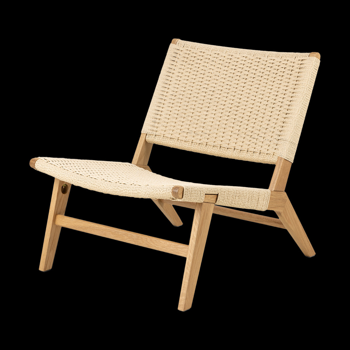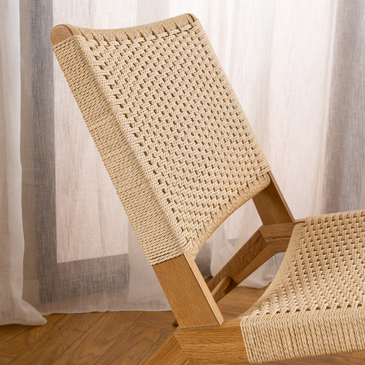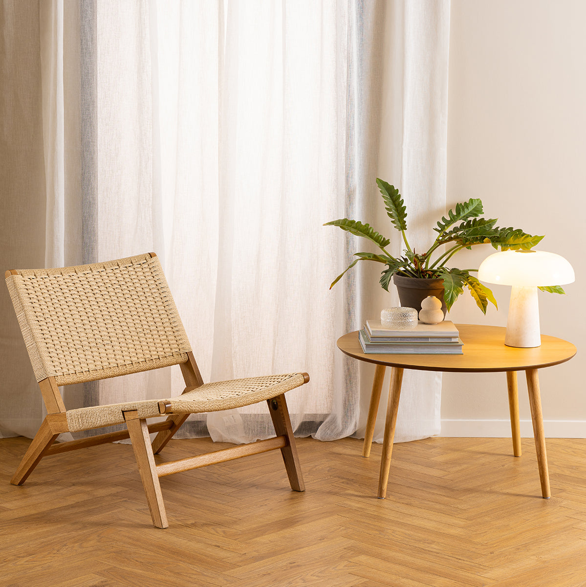 Deze fauteuil is gemaakt van hout en heeft een comfortabele, gewoven zitting in een beige tint. Hierdoor heeft deze houten loungestoel de ultieme natuurlijke uitstraling die perfect aansluit bij de Scandinavische woonstijl. Het compacte formaat maakt deze kleine fauteuil perfect voor verschillende ruimtes, van de woonkamer tot een knusse leeshoek. Het natuurlijke hout en de neutrale beige tint creëren een warme, uitnodigende sfeer.