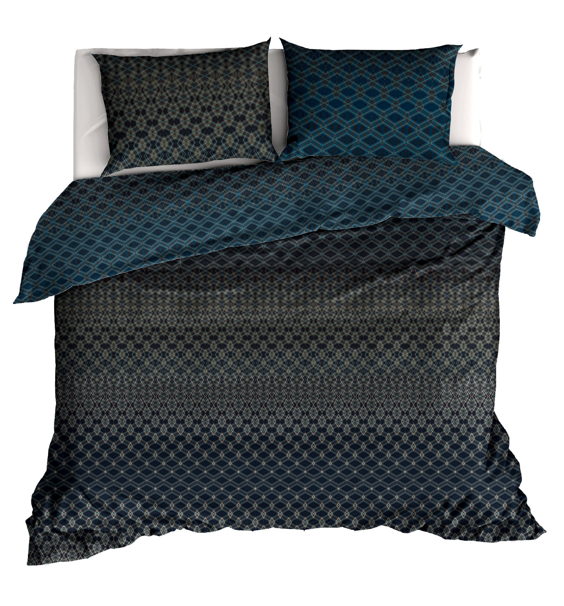 Dekbedovertrek Finley van Livello heeft een dessin van overlopende banen met grafische motieven. De donkerblauw en donkergroen tinten lopen prachtig in elkaar over. Het geeft het geheel een stoere en chique uitstraling. Het overtrek is gemaakt van een heerlijke 100% katoen satijn kwaliteit. Bij de 2-persoons en lits-jumeaux overtrekken worden standaard twee kussenslopen bijgeleverd, bij de 1-persoons overtrekken wordt er een kussensloop bijgeleverd. Dit overtrek heeft een instopstrook over de gehele breedte aan beide zijden, daardoor ook uitstekend geschikt voor xl-maten. Dit dekbedovertrek is extra lang, namelijk 260 cm. Door de extra lange instopstrook worden koude voeten voorkomen en is het overtrek makkelijk onder de matras te stoppen.