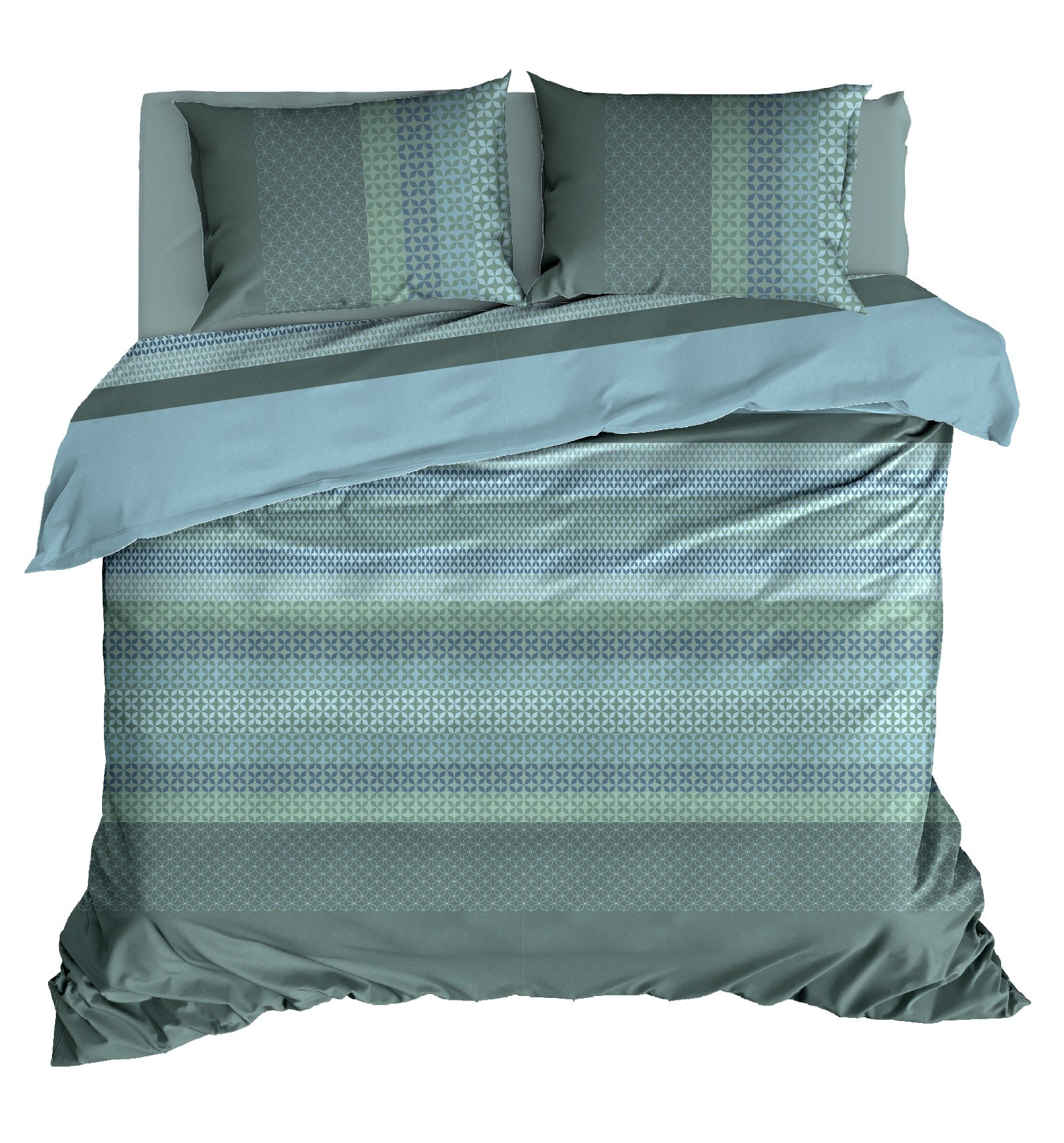 Dekbedovertrek Kirana Blue Green van Livello is gemaakt van 100% katoen kwaliteit. Het dekbedovertrek heeft een blauw groene kleur en bestaat uit verschillende horizontale banen met verschillende motieven op zowel de voor- als achterkant van het overtrek. De motieven staan ook in verticale banen op het kussensloop.