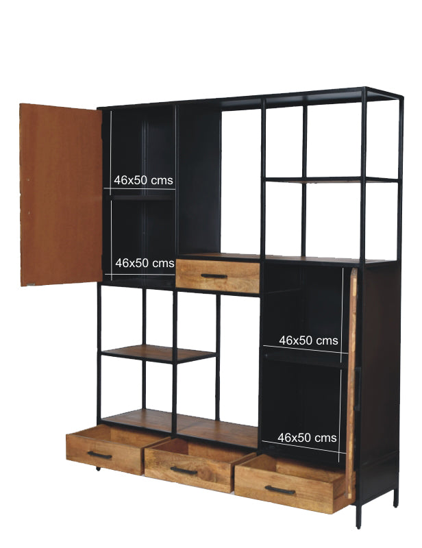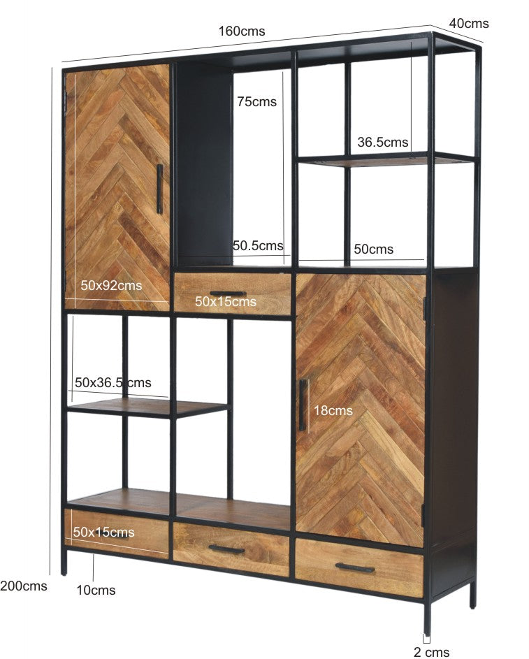 Belangrijke informatie: - De kabinetkast heeft diverse open vakken, lades en afgesloten opbergvakken - Afmetingen van het artikel: 200x160x40cm - Gemaakt van mangohout en gecoat staal - Goed te combineren in veel veschillende interieurstijlen