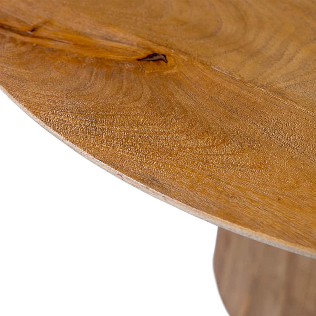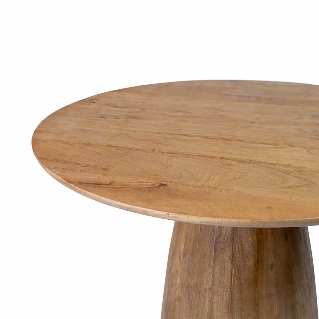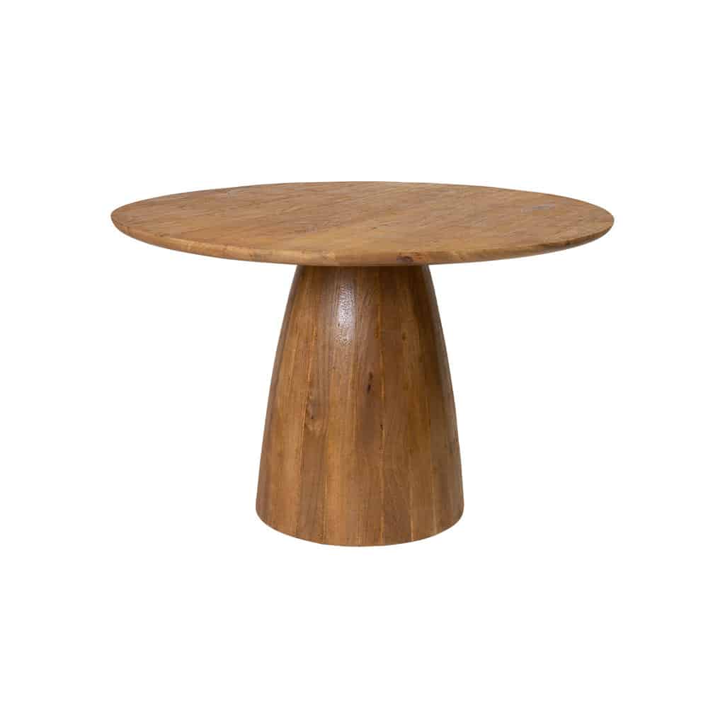 Op zoek naar een leuke gezellige eetkamertafel? Dan is ronde eettafel Bruto echt wat voor jou! Bruto is vriendelijk door zijn vorm, maar de afwerking van de tafel maakt de tafel robuust. De ronde eettafel is gemaakt van geborsteld mangohout. Het borstelen van het hout zorgt ervoor dat het hout meer structuur krijgt. De nerven en vlammen in het hout komen hierdoor ook meer naar voren. Hierdoor krijg je een wat meer robuuste tafel. De subtiel afgeschuinde afwerking van de tafelpoot geeft ronde eettafel Bruto net wat extra’s.