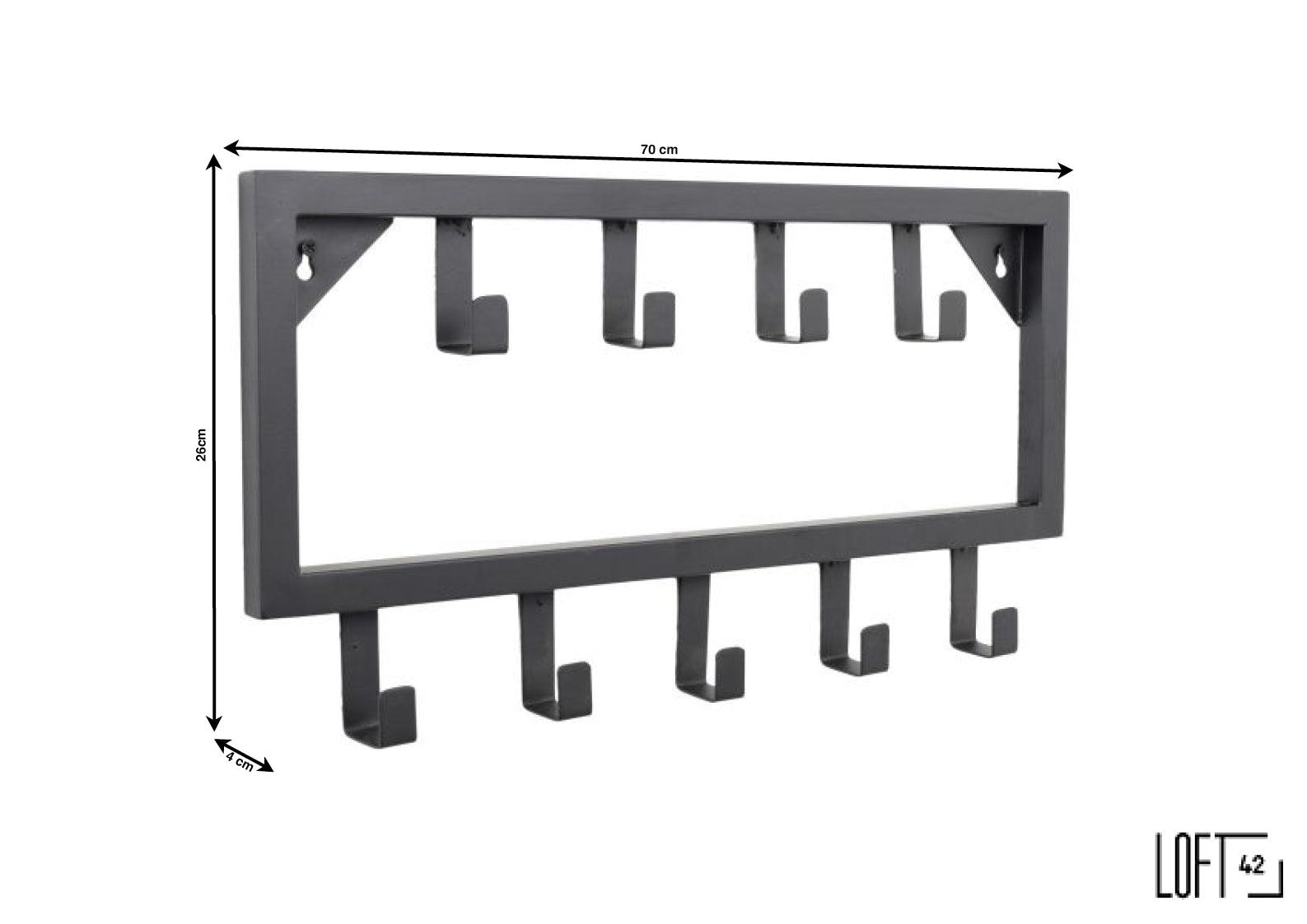 Voor een opgeruimde gang is een kapstok essentieel. De wandkapstok is hierbij het meest gebruikte item. Door je jas op te hangen aan de wand, blijft de vloer vrij en behoud je meer ruimte! De LOFT42 Bono Small is gemaakt van sterk en robuust mat zwart metaal en heeft een strak design. De grote haken bieden 9 ophang mogelijkheden. Hierdoor heb je extra veel ruimte om alle jassen van jou en je bezoek op te hangen. Specificaties: