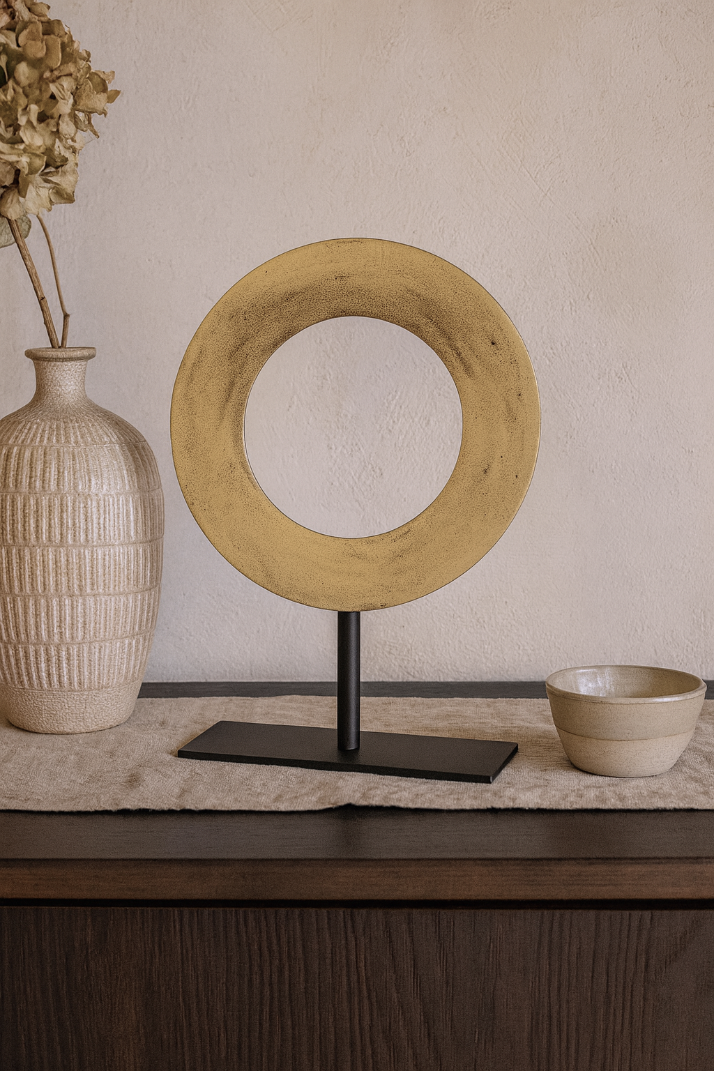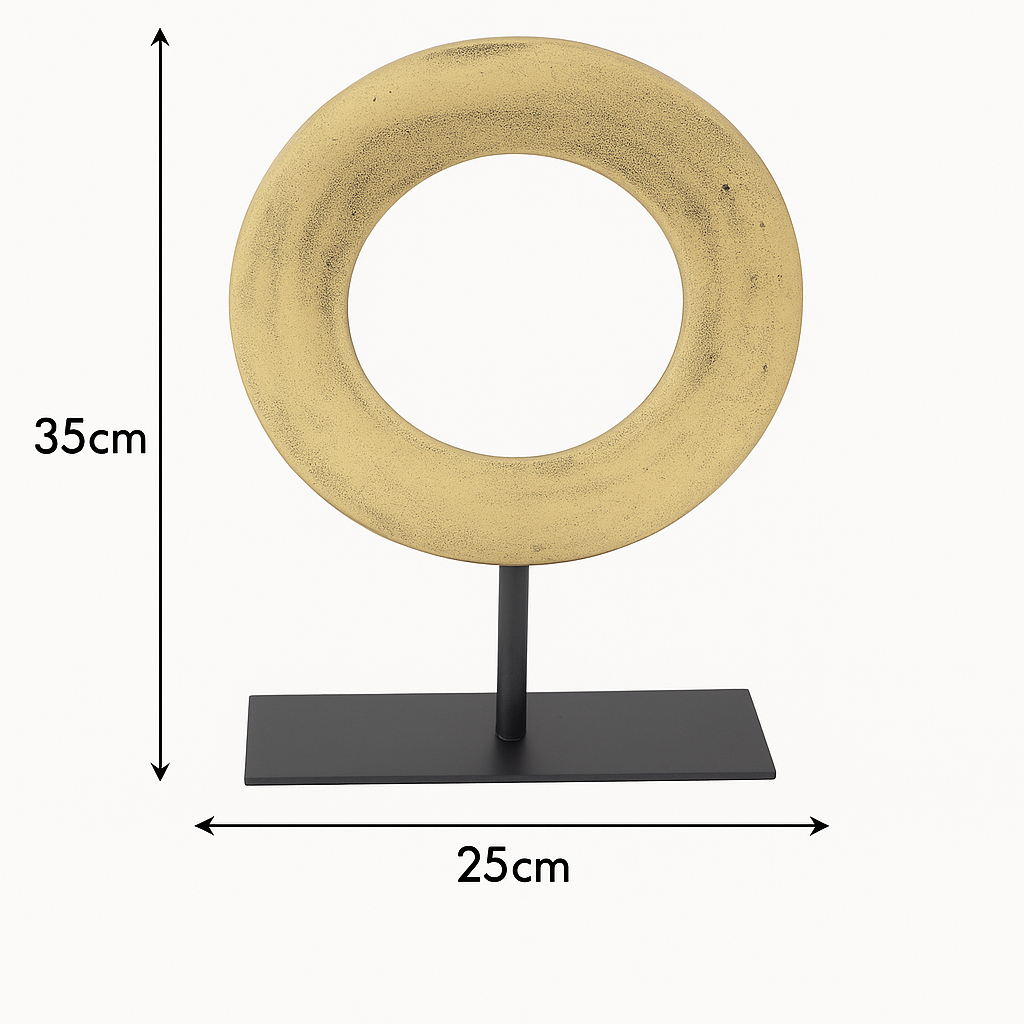 Breng warmte en elegantie in je interieur met deze messingkleurige metalen cirkel op voet. De goudtint geeft een luxe uitstraling zonder overheersend te zijn, waardoor dit decoratieve object perfect past binnen een Japandi, Scandinavisch of modern interieur.