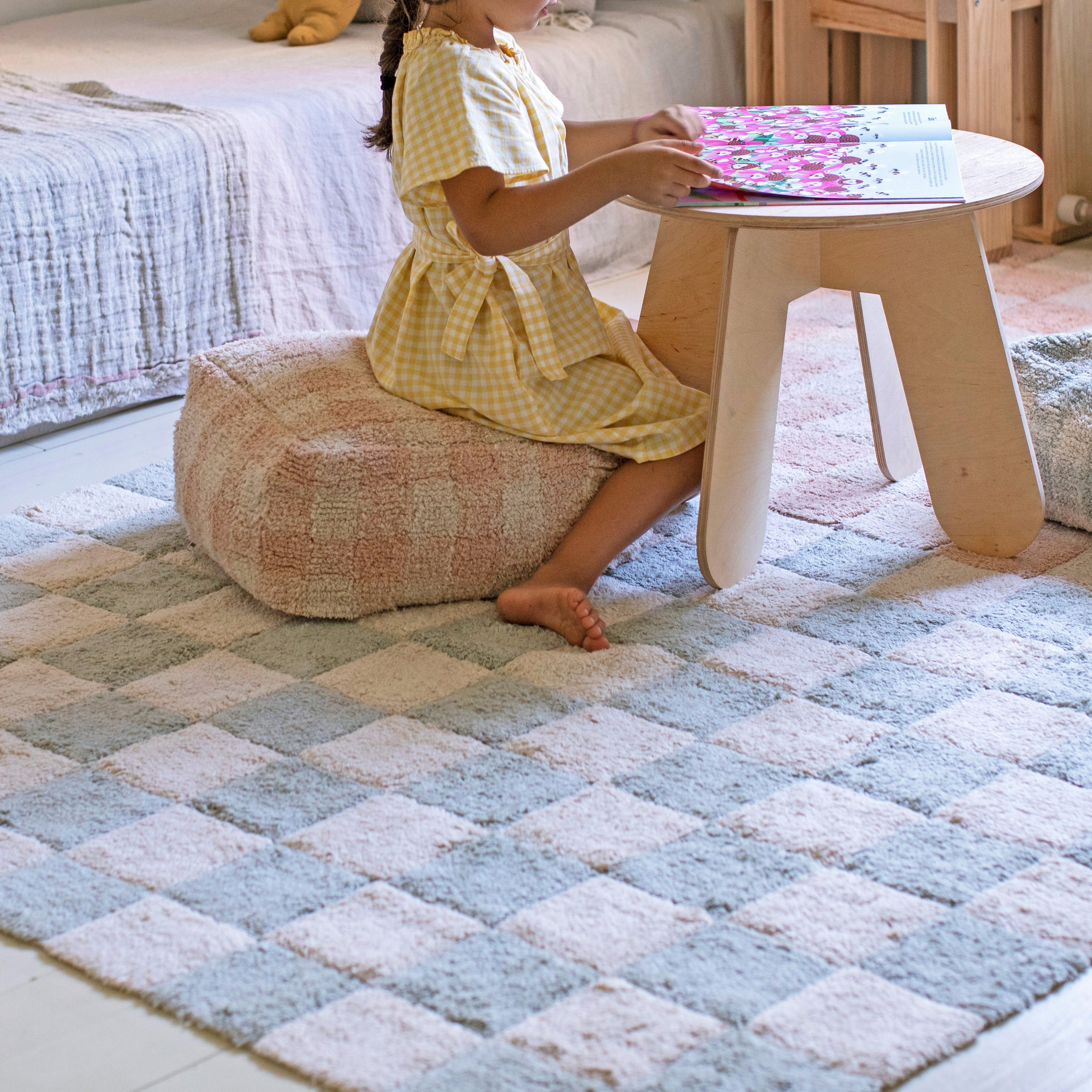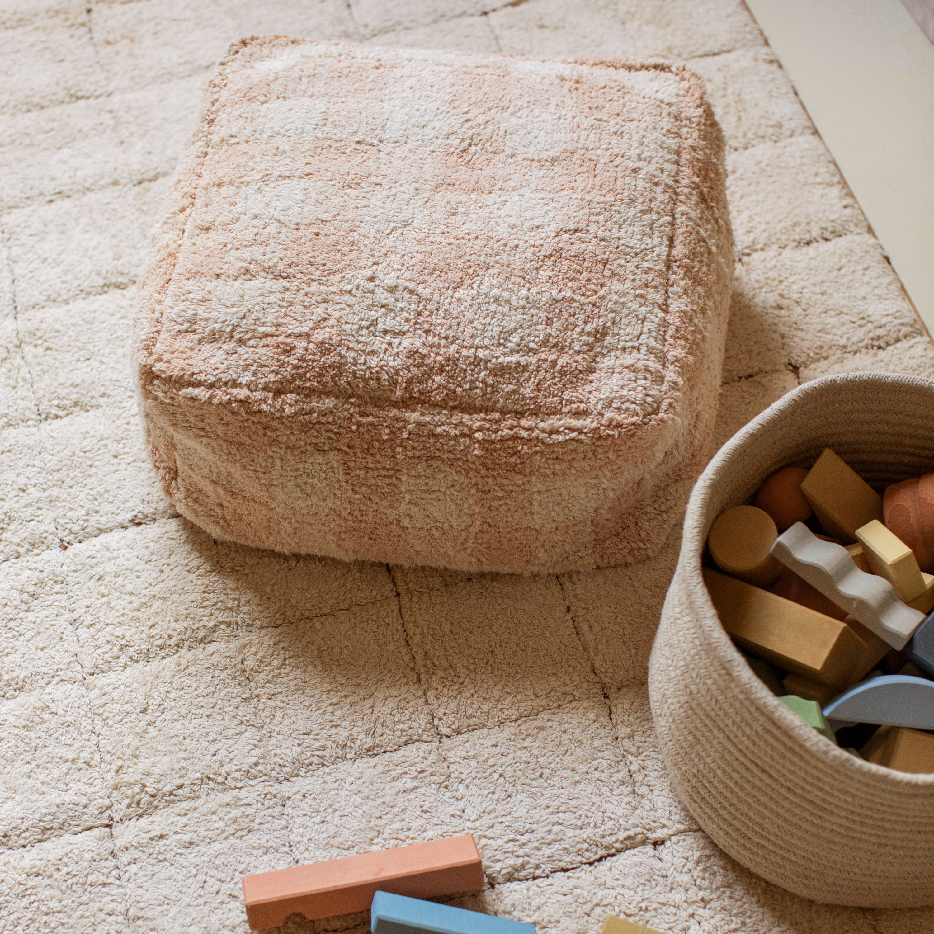 Wasbaar, praktisch en kindproof De hoes van elke poef is afneembaar en wasbaar (volg het waslabel). Lichtgewicht, stevig en veilig dankzij de zachte texturen en afgeronde vormen. Gevuld met polystyreen bolletjes voor een comfortabele zit die met je kind meebeweegt.