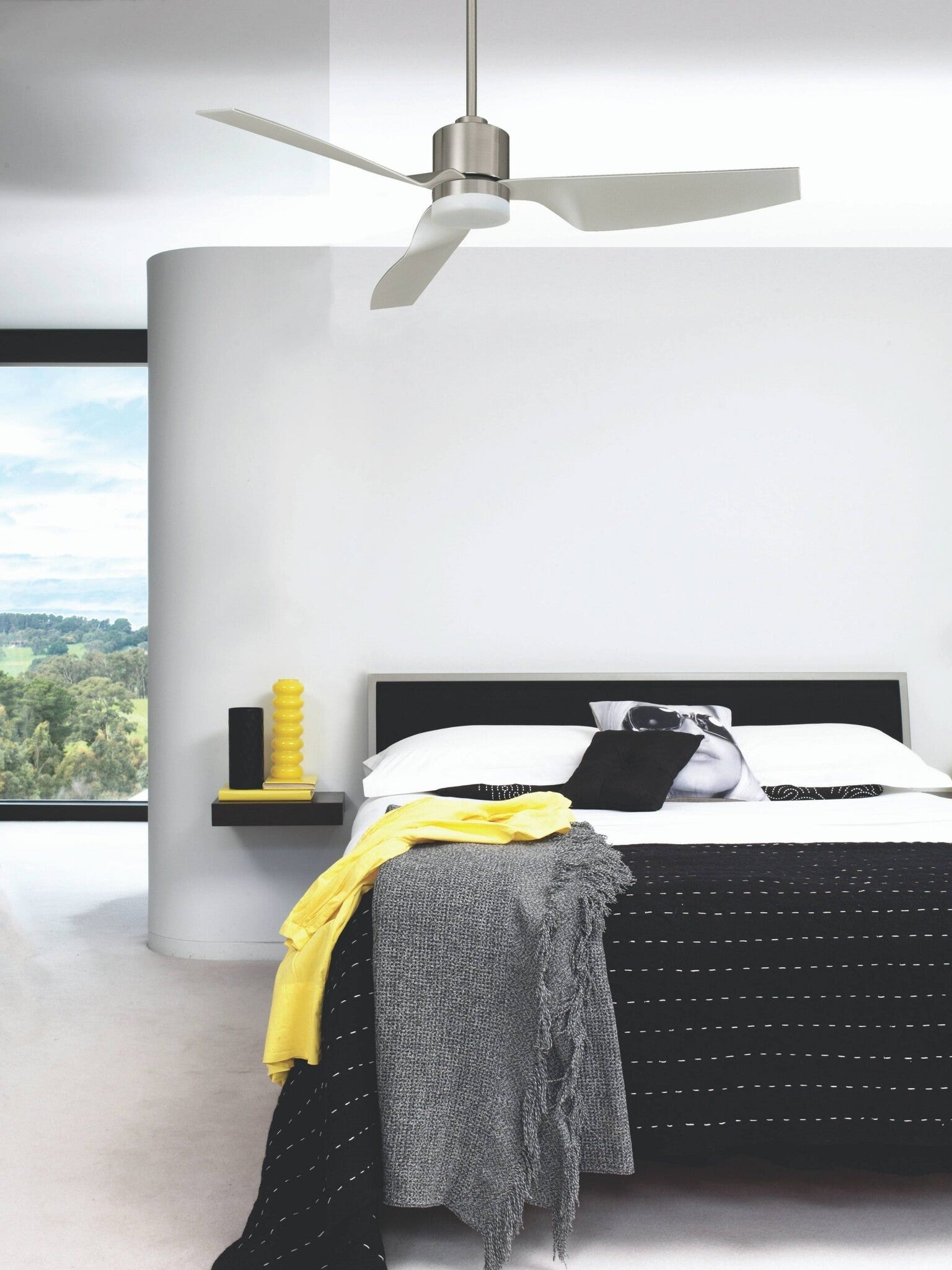 Het model Airfusion Climate II van het Australische designmerk Lucci Air is een hoogwaardige plafondventilator met een modern vormgegeven 3-blads propeller van torsievrij, duurzaam acryl.