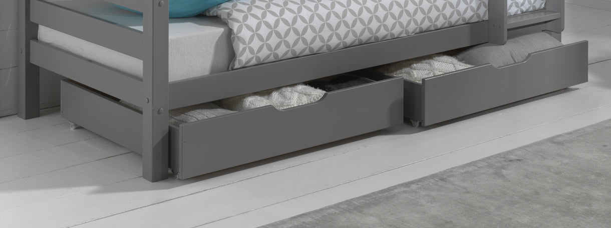 LET OP! U ontvangt enkel een rolbed voor onder een 90x200cm bed. Deze set van 2 grijsgelakte PINO lades bestaat uit massief Scandinavisch grenen hout. Deze 2 lades zijn perfect compatibel met onze PINO stapelbedden. Deze lades zijn jammer genoeg niet combineerbaar met het PINO Martin familiebed. Ontdek de belangrijkste kenmerken van dit product in onderstaande punten: