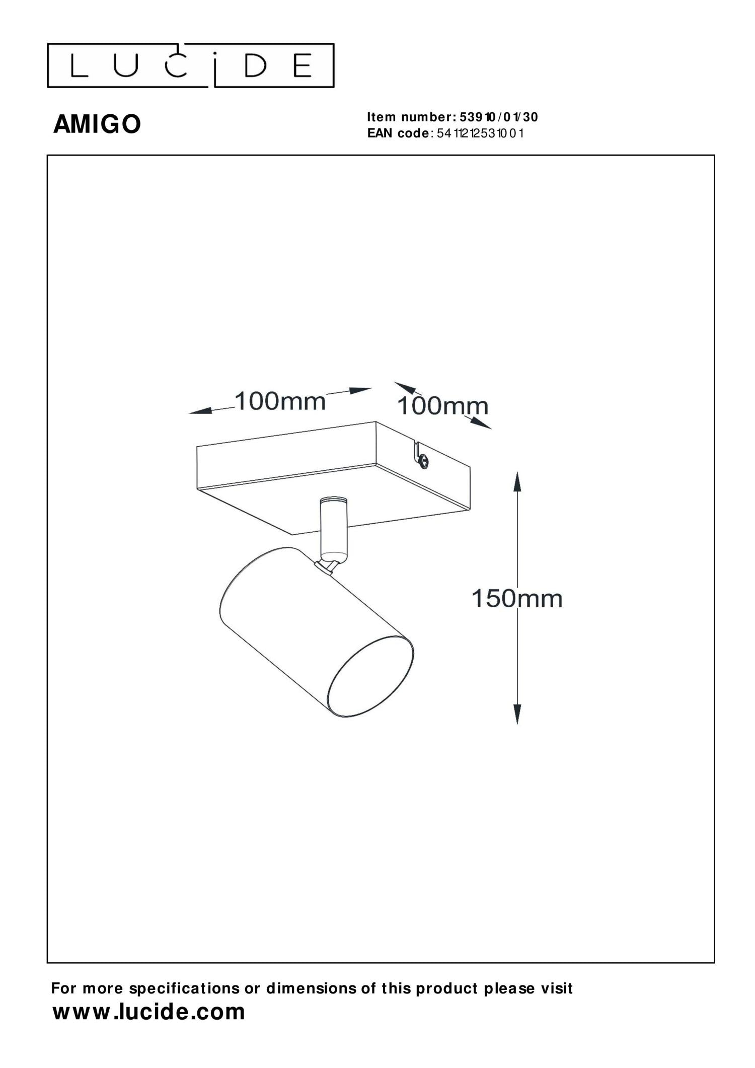 De Lucide AMIGO Plafondspot biedt een stijlvolle combinatie van eigentijds design en praktische functionaliteit. Met zijn compacte afmetingen van lengte 10 cm, breedte 10 cm, en hoogte 15 cm past deze lamp perfect in moderne interieurs. Het robuuste metalen frame en de strakke matzwarte afwerking zorgen voor een tijdloze uitstraling. Dankzij de draaibare en kantelbare lampkop, die bovendien in hoogte verstelbaar is na installatie, biedt de AMIGO flexibiliteit voor gerichte verlichting of sfeervolle accenten. Compatibel met LED-lichtbronnen (GU10) en eenvoudig aan te sluiten op een dimmer (exclusief), combineert deze wandspot energiezuinigheid met veelzijdigheid. Voeg een vleugje stijl toe aan uw woonkamer, keuken of gang met de veelzijdige Lucide AMIGO Wandspot – verlichting met een modern karakter. Unieke productkenmerken: • Geschikt voor toepassing met LED lichtbron • Deze lamp is draaibaar en kantelbaar • Eenvoudig aan te sluiten op een dimmer (excl.) • Vervaardigd uit hoogwaardig metaal Belangrijke productkenmerken: • Verbruik: 1x40W / 230V / Dimbaar (lichtbron niet inbegrepen) • Afmetingen: L.10 x B.10 x H.15 cm • 2 Jaar garantie op het armatuur / Passende lichtbron is EAN: 5411212490643 Waarom kiezen voor Lucide verlichting? Lucide staat voor trendsettend design, vakmanschap en betrouwbaarheid. Als Belgisch familiebedrijf met ruim drie decennia aan expertise ontwerpen wij hoogwaardige verlichting die elke ruimte – binnen én buiten – verrijkt en transformeert. Onze veelzijdige collectie omvat duurzame armaturen en energiezuinige lichtbronnen, zorgvuldig ontworpen door onze eigen experts en geproduceerd volgens de strengste CE-normen. Met ons uitgebreide assortiment bieden we jou altijd een geschikte lichtoplossing, ongeacht stijl of ruimte. Zo verlichten we niet enkel jouw leefruimte maar ook jouw keuzeproces in de zoektocht naar kwalitatieve betaalbare verlichting. Bij Lucide combineren we innovatie met vakmanschap, voor verlichting die niet alleen sfeer toevoegt, maar van ieder huis een thuis maakt.