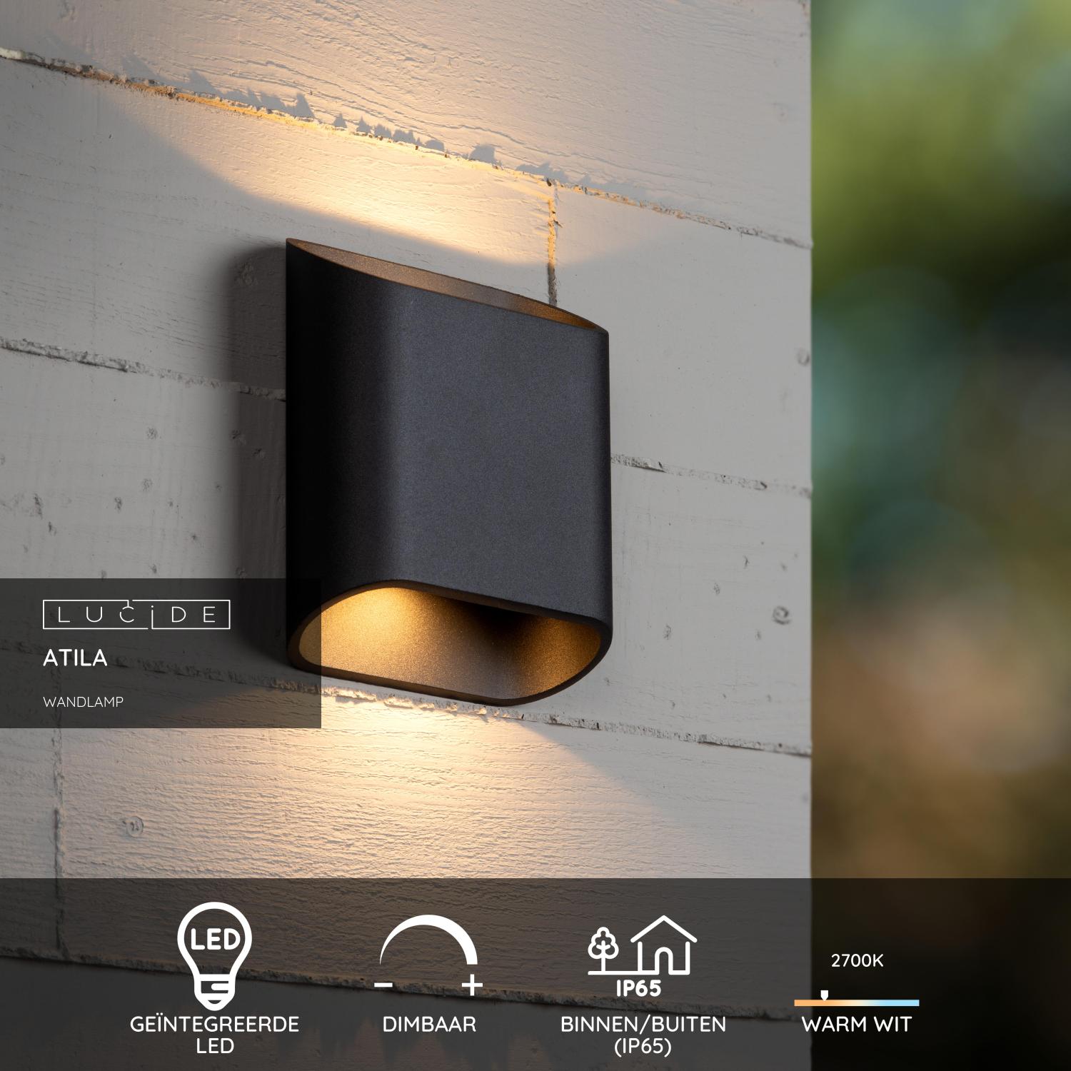 Geef je buitenruimte een stijlvolle upgrade met de Lucide ATILA wandlamp. Deze moderne wandverlichting voor buiten combineert een strak rechthoekig design met hoogwaardige functionaliteit. Met geïntegreerde dimbare LED lichtbronnen (2x5W) biedt de wandlamp warm wit licht (2700K), perfect voor sfeervolle verlichting van je gevel of terras. Dankzij de IP65-bescherming is deze wandlamp optimaal bestand tegen regen en stof. Met een breedte van 6,4 cm, een diepte van 16 cm en een hoogte van 18 cm past de ATILA moeiteloos op iedere buitenmuur. Creëer eenvoudig de gewenste sfeer met de compatibele dimfunctie en geniet van duurzame buitenverlichting. Unieke productkenmerken: • Uitgerust met geïntegreerde dimbare LED lampen • Uitgerust met warm wit licht (2700K) • Eenvoudig aan te sluiten op een dimmer (excl.) • Vervaardigd uit hoogwaardig aluminium Belangrijke productkenmerken: • Speciaal ontworpen voor langdurig en betrouwbaar buitengebruik (Conform IP65) • Verbruik: 2x5W / 230V / Dimbaar (Lichtbronnen inbegrepen) • Afmetingen: L.16 x B.6,4 x H.18 cm • 3 Jaar garantie op het armatuur Waarom kiezen voor Lucide verlichting? Lucide staat voor trendsettend design, vakmanschap en betrouwbaarheid. Als Belgisch familiebedrijf met ruim drie decennia aan expertise ontwerpen wij hoogwaardige verlichting die elke ruimte – binnen én buiten – verrijkt en transformeert. Onze veelzijdige collectie omvat duurzame armaturen en energiezuinige lichtbronnen, zorgvuldig ontworpen door onze eigen experts en geproduceerd volgens de strengste CE-normen. Met ons uitgebreide assortiment bieden we jou altijd een geschikte lichtoplossing, ongeacht stijl of ruimte. Zo verlichten we niet enkel jouw leefruimte maar ook jouw keuzeproces in de zoektocht naar kwalitatieve betaalbare verlichting. Bij Lucide combineren we innovatie met vakmanschap, voor verlichting die niet alleen sfeer toevoegt, maar van ieder huis een thuis maakt.