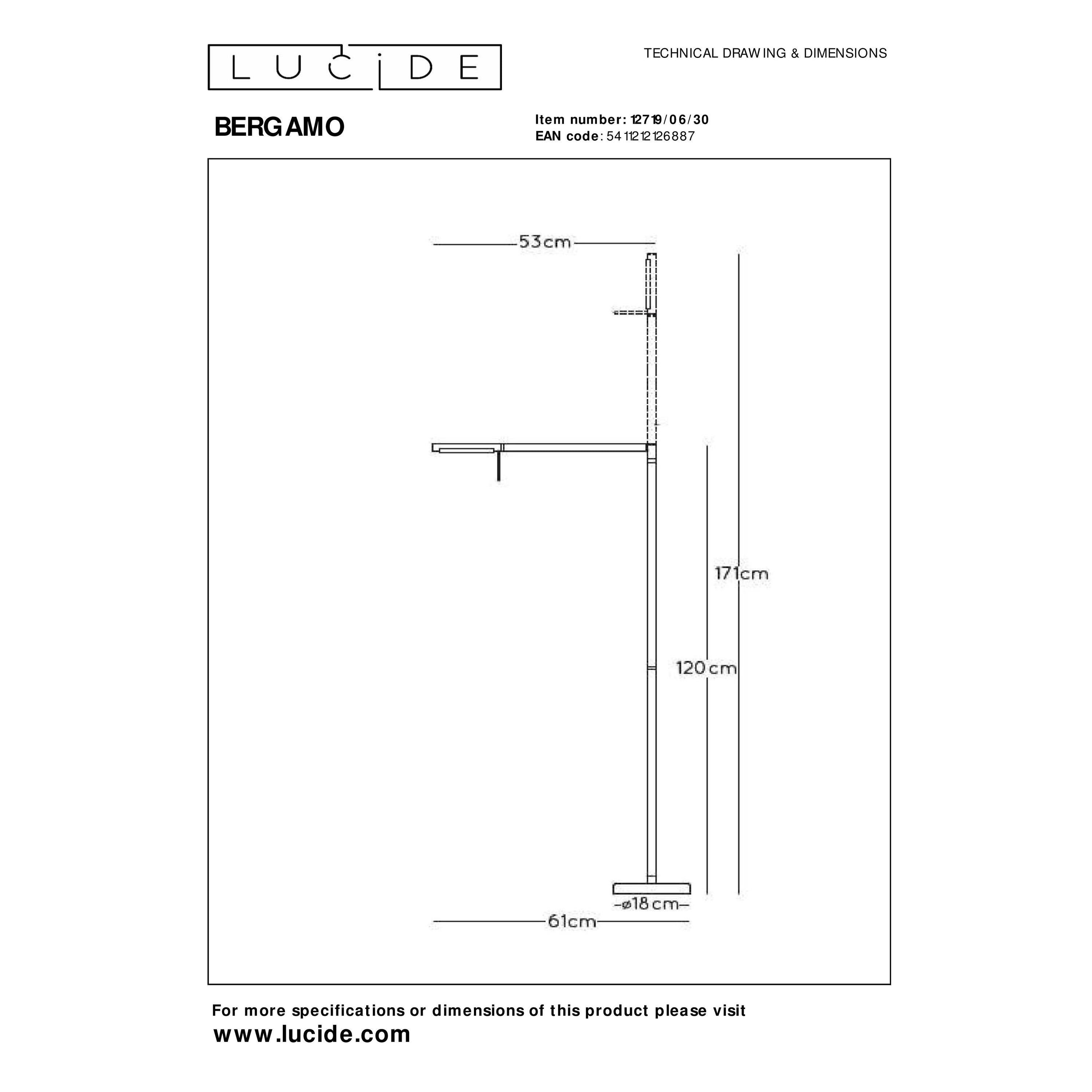 Eenvoud, flexibiliteit, karakter en de laatse LED lichttechniek . Deze eigenschappen werden verenigd in het design van de Bergamo LED leeslamp van Lucide. De vloerlamp die opvalt door zijn onopvallendheid, de Bergamo laat zich namelijk werkelijk op iedere plek in huis waar hij van dienst kan zijn plaatsen. Naast een bank, bed of donkere hoek in de kamer geeft de Bergamo zijn warme LED licht. Gedimd voor sfeer en voluit voor perfect lees en werklicht. De 6W touch dimbare Osram LED's staan voor kwaliteit, energiebesparing en duurzaamheid. De dimfunctie werd stijlvol verwerkt in de kop van de Bergamo, de plek van aanraken subtiel aangeduid met een klein blauw ledje die uitgaat wanneer de lamp inschakelt. De Bergamo LED leeslamp komt in geborsteld staal en zwart. Unieke productkenmerken: • Uitgerust met geïntegreerde dimbare LED lamp • Uitgerust met warm wit licht (3000K) • Deze lamp is in hoogte verstelbaar, draaibaar en kantelbaar • "Dimbaar via ""touch"" sensor op de lamp" • Vervaardigd uit hoogwaardig metaal Belangrijke productkenmerken: • Verbruik: 1x6,9W / 230V / Dimbaar (incl.) • Afmetingen: L.18 x B.61 x H.171 cm • 3 Jaar garantie op het armatuur Waarom Lucide verlichting kopen? Lucide ontwikkelt en produceert sinds haar oprichting in 1992 hoogwaardige en trend zettende lichtoplossingen. Deze 2 elementen zijn de basis voor het toonaangevend assortiment van het in Antwerpen gevestigde bedrijf. Een team van Lucide designers, aangevuld met freelance ontwerpers, ontwikkelen dagelijks tal van nieuwe producten. Innovatieve materiaalkeuze, vormgeving en kleurtoepassing in combinatie met de meest actuele lichttechnologie stelt Lucide daarbij continue centraal.